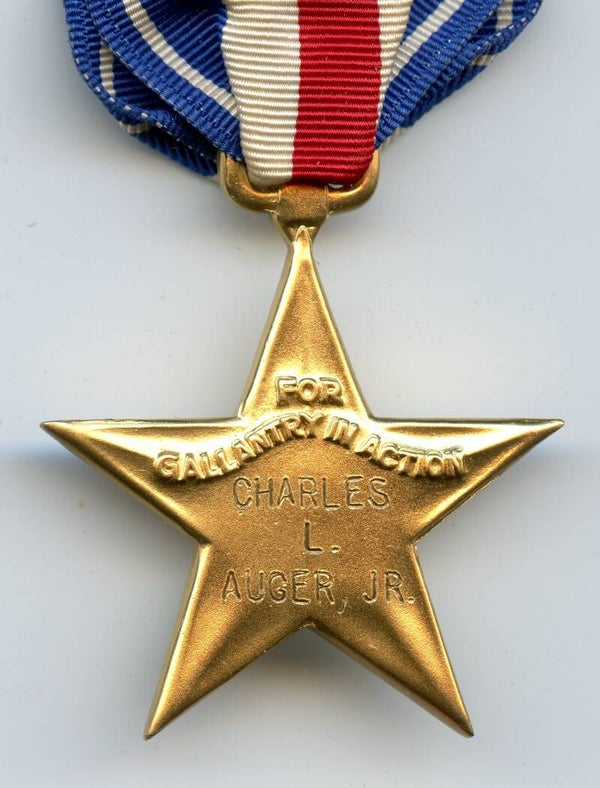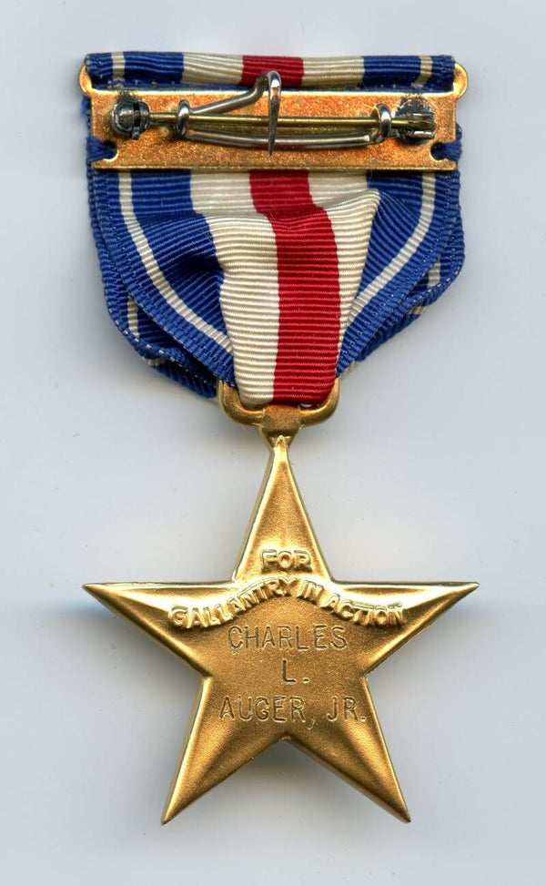WW1 original named Silver Star Medal. The medal comes with its period original slot brooch meganism and ribbon. The medal is of period production and remains in an excellent condition. The medal is government engraved and named to Charles L. Auger Jr. whom was a soldier in the 319th Infantry Regiment of the 80th Infantry Division. According to the research we have on this Silver Star Auger most likely received his Silver Star for actions during the Meuse-Argonne Offensive. But more research can definitely be done on this. Exceptional historically important medal in excellent condition with lots of further research potential! No repairs, no damage.