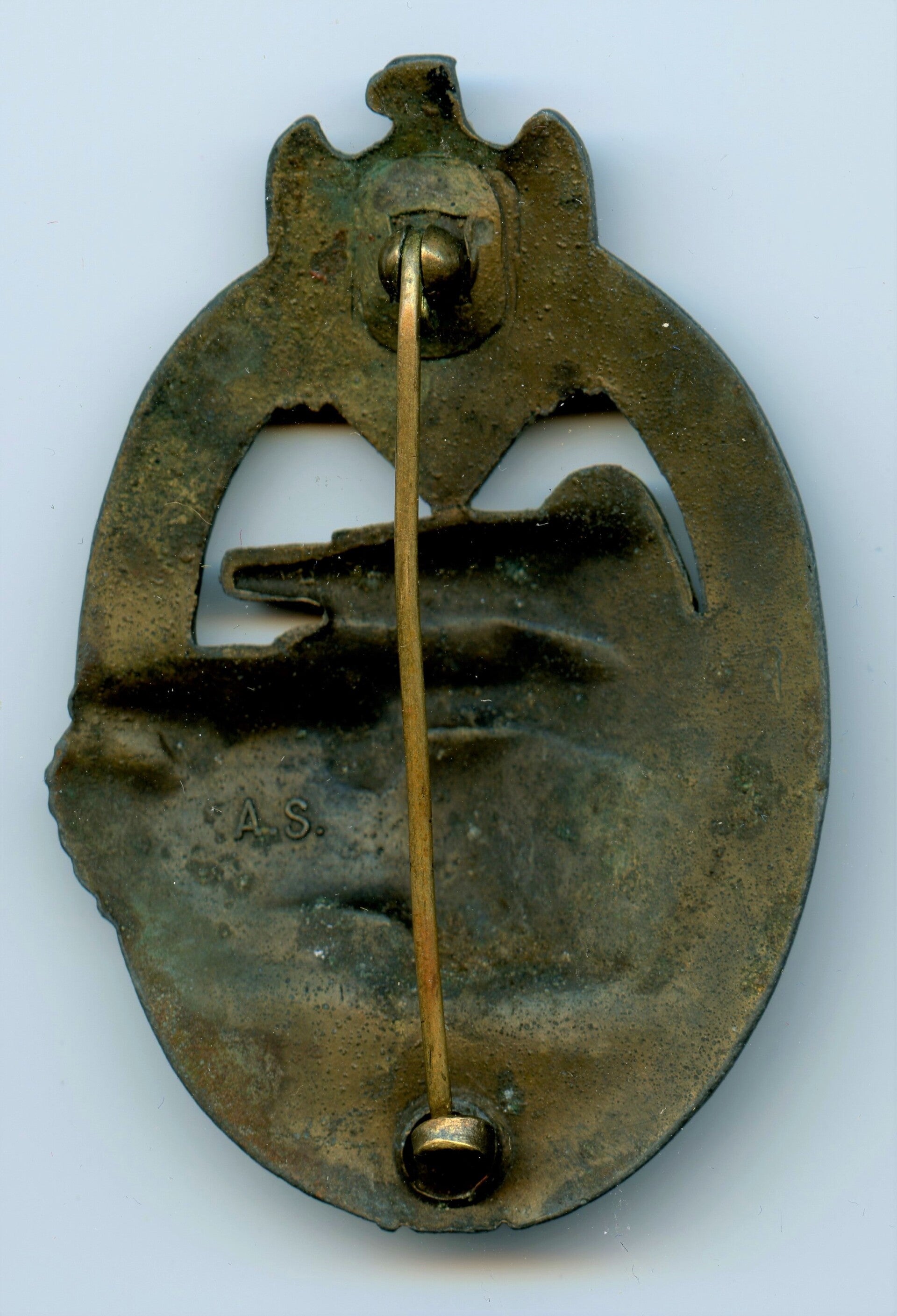 Nice Bronze Panzer Assault Badge by Adolf Scholze, Gablonz. Zinc construction with crimped in hardware. The badge is maker marked with "A.S." pressumably being Adolf Scholze. The badge remains in good condition with a nice amount of bronze finish preserved. Great looking PAB in good condition. No repairs, no damage.