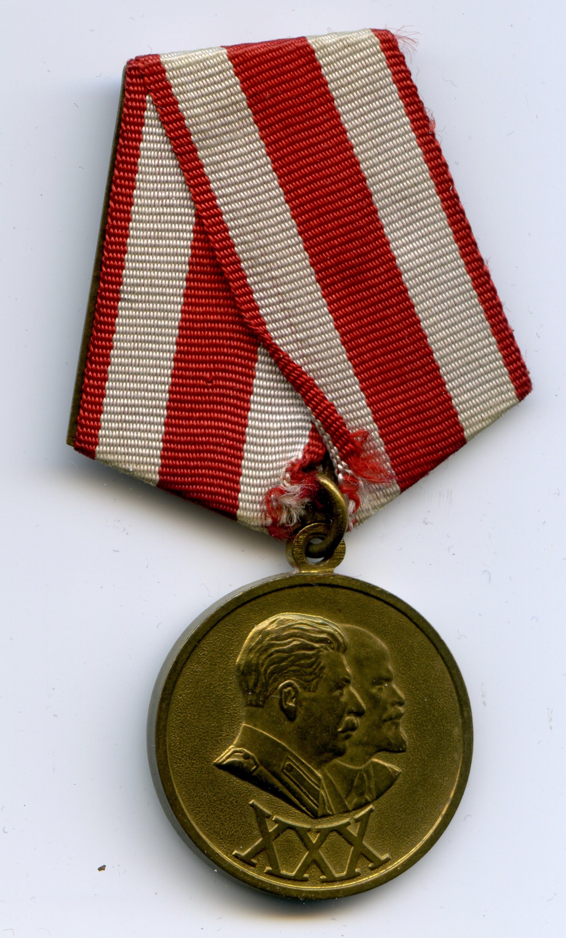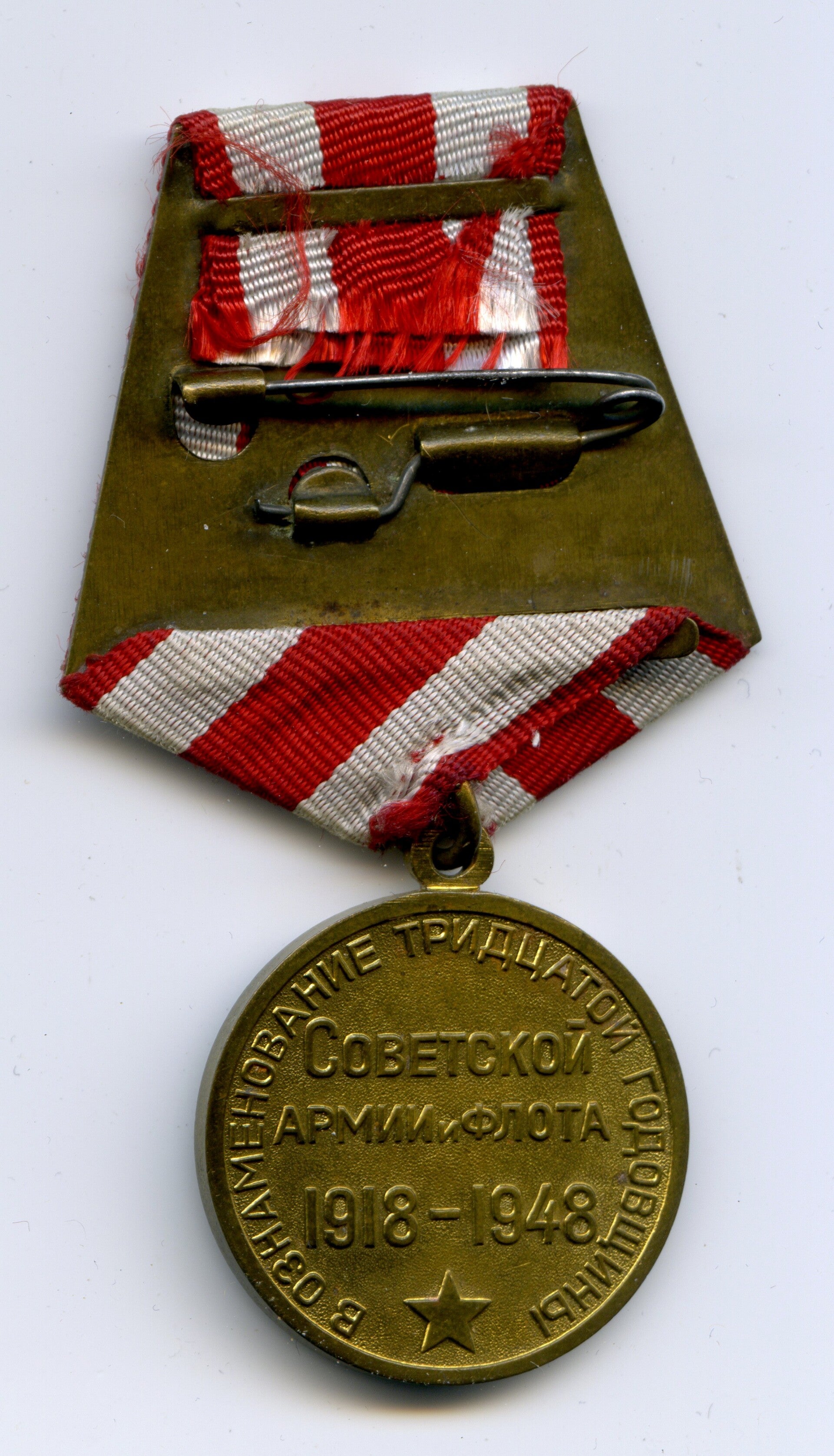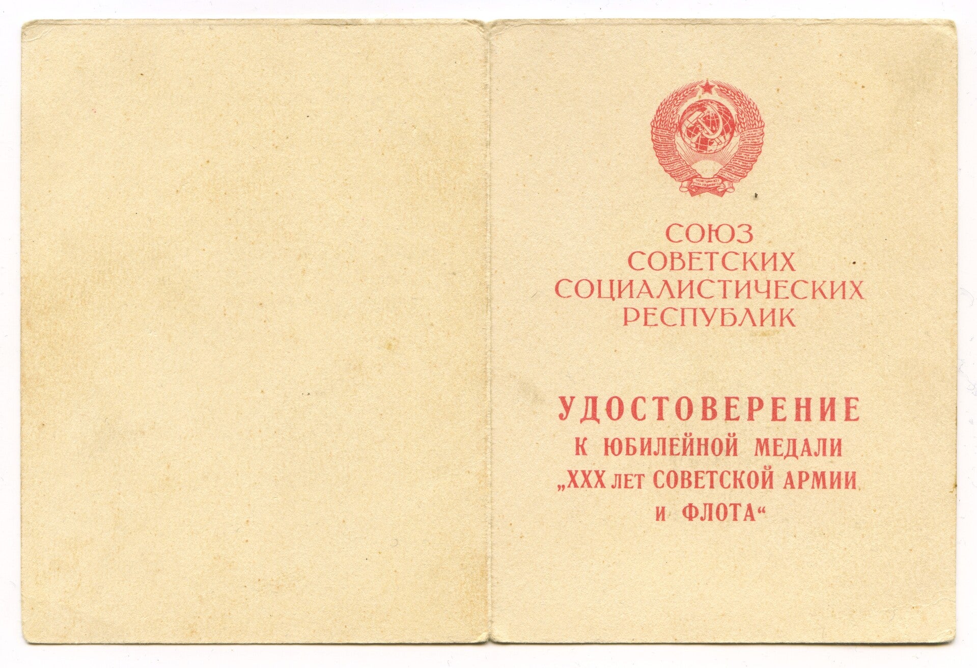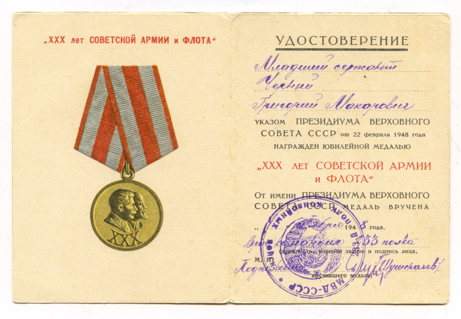 The document for the 30 Years Jubilee of the Soviet Army and Navy Medal has been awarded in 1948.