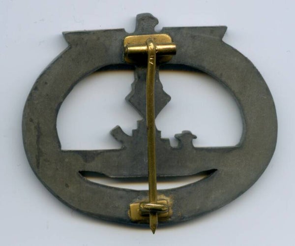 Nice and detailed U-boat badge produced by Alois Rettenmaier, Schwäbisch Gmünd. Zinc construction with soldered on hardware. The badge is unmarked but has the typical Rettenmaier set up. The badge has unfortunately lost most of its finish but still has its golden pin and set up. Nice detailed Rettenmaier U-boat badge. No repairs, no damage
