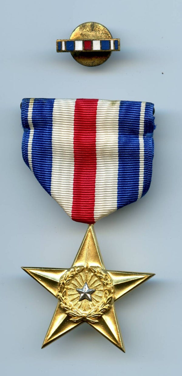 An original WW2 cased Silver Star medal. The medal comes in its original case of issue together with its lapel pin. The medal comes with a slot brooch mechanism, indicating production during WW2. Excellent set in near mint condition! No repairs, no damage.