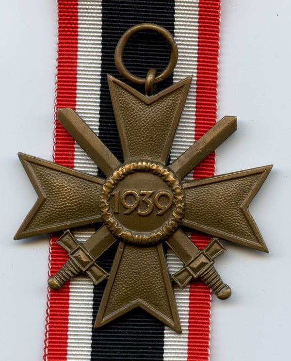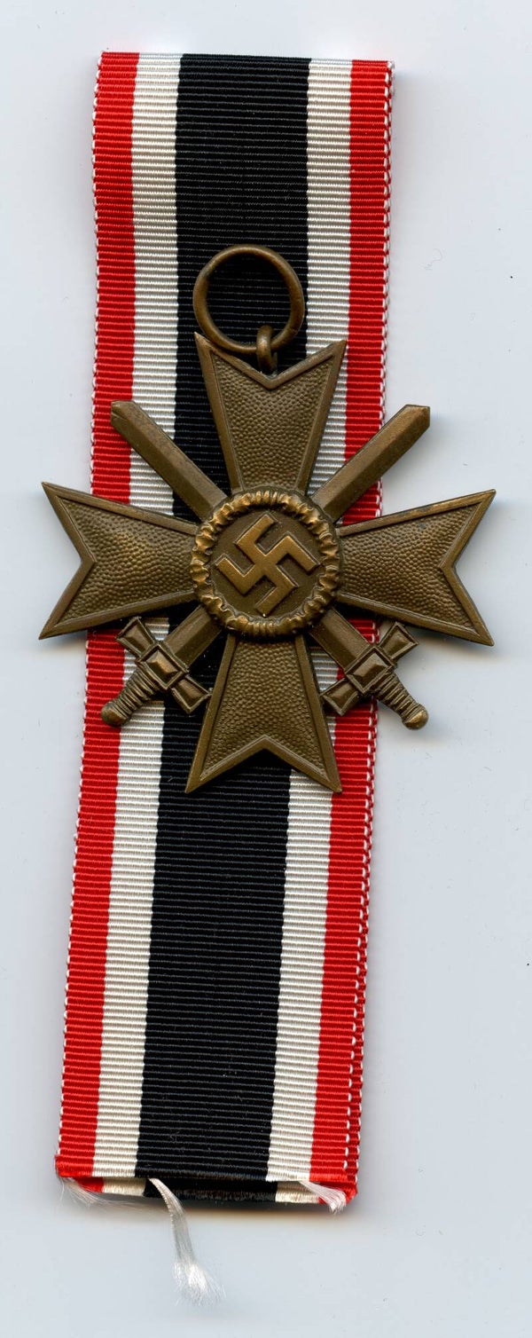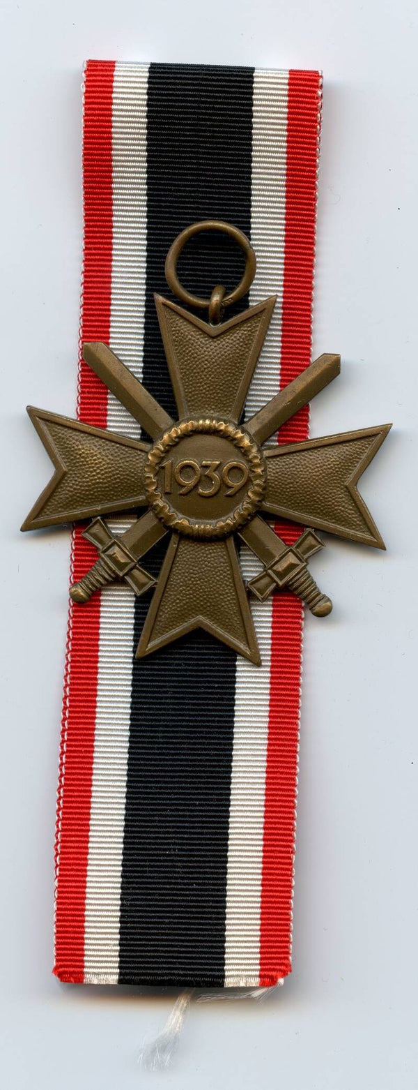 Nice KVK 2nd Class with Swords produced by Rudolf Wächtler & Lange, Mittweida. Tombac construction. The cross is marked on the ring with "100" indicating production by W&L. Nice cross in excellent condition, comes with its original long ribbon. Great cross! No repairs, no damage.