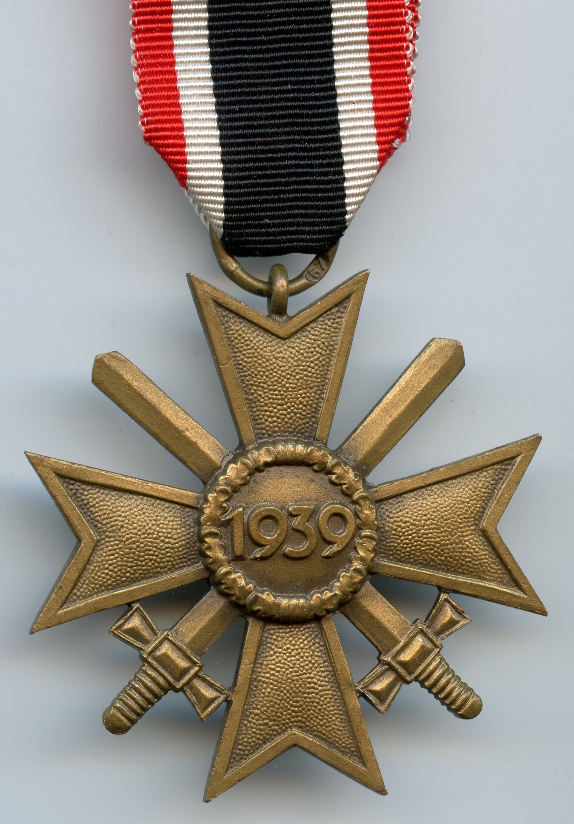 Nice KVK 2nd Class with Swords produced by R. Kreisel, Gablonz an der Neiße. Tombac construction. The cross is marked on the ring with "67" indicating production by Kreisel. Nice cross in excellent condition, comes with its original long narrow ribbon. Great cross! No repairs, no damage.