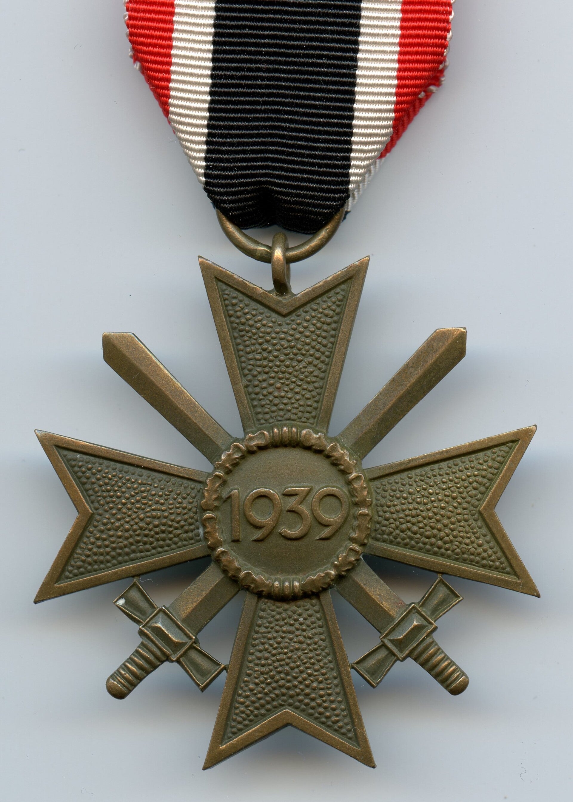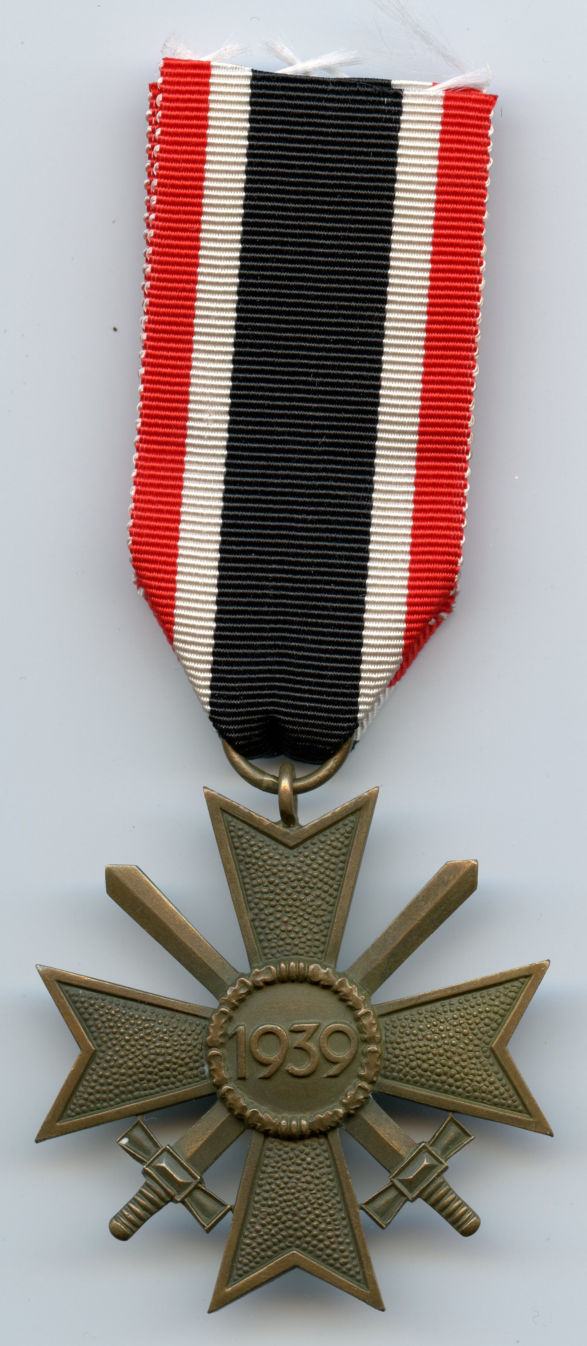 Nice KVK 2nd Class with Swords produced by Gebrüder Bender, Idar-Oberstein. Tombac construction. The cross is marked on the ring with "41" indicating production by Bender. Nice cross in excellent condition, comes with its original ribbon. Great cross! No repairs, no damage.