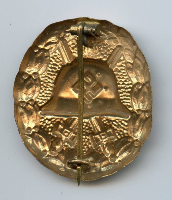 Nice hard to find first pattern gold wound badge. Tombac construction, unmarked and with an excellent amount of gold finish still present. The badge was most probably facotry converted with a swastika to a first pattern badge, this due to its 1918 helmet shape. Excellent very hard to find badge in great condition. No repairs, no damage!