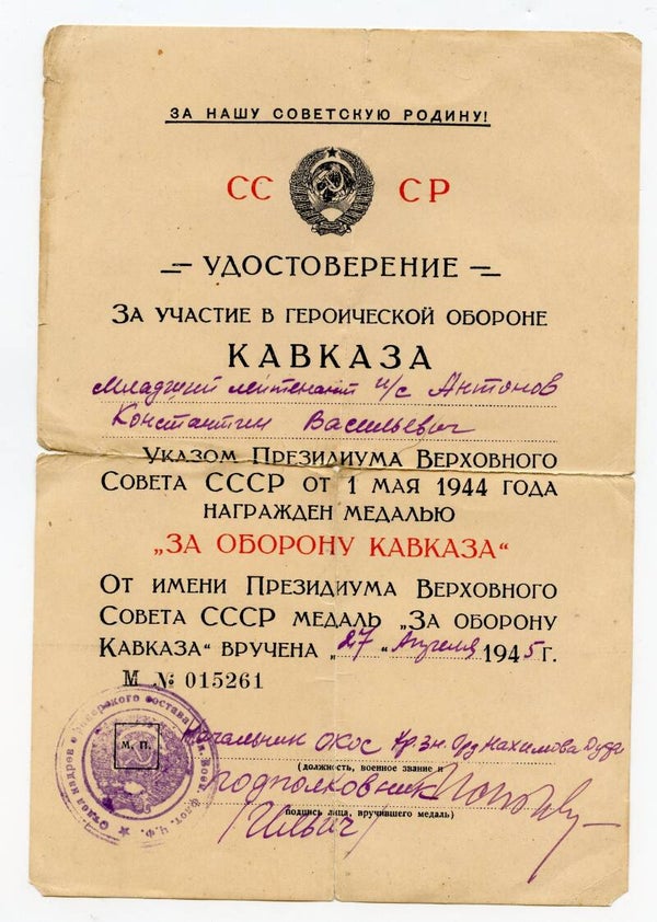 Very nice original medal for the Defense of the Caucasus and document. The medal comes with its original double steel suspension. The medal is of the first type and remains in a great condition! Nice medal for the Defense of the Caucasus with no repairs, no damage. The document is numbered 15261 and awarded in the field on the 27th of April 1945. The medal and document have been awarded to Junior Lieutenant Konstantin Vasilyeva Antonov. Nice original document with no repairs, no damage. Great one of a kind set!