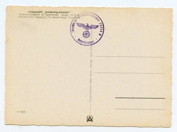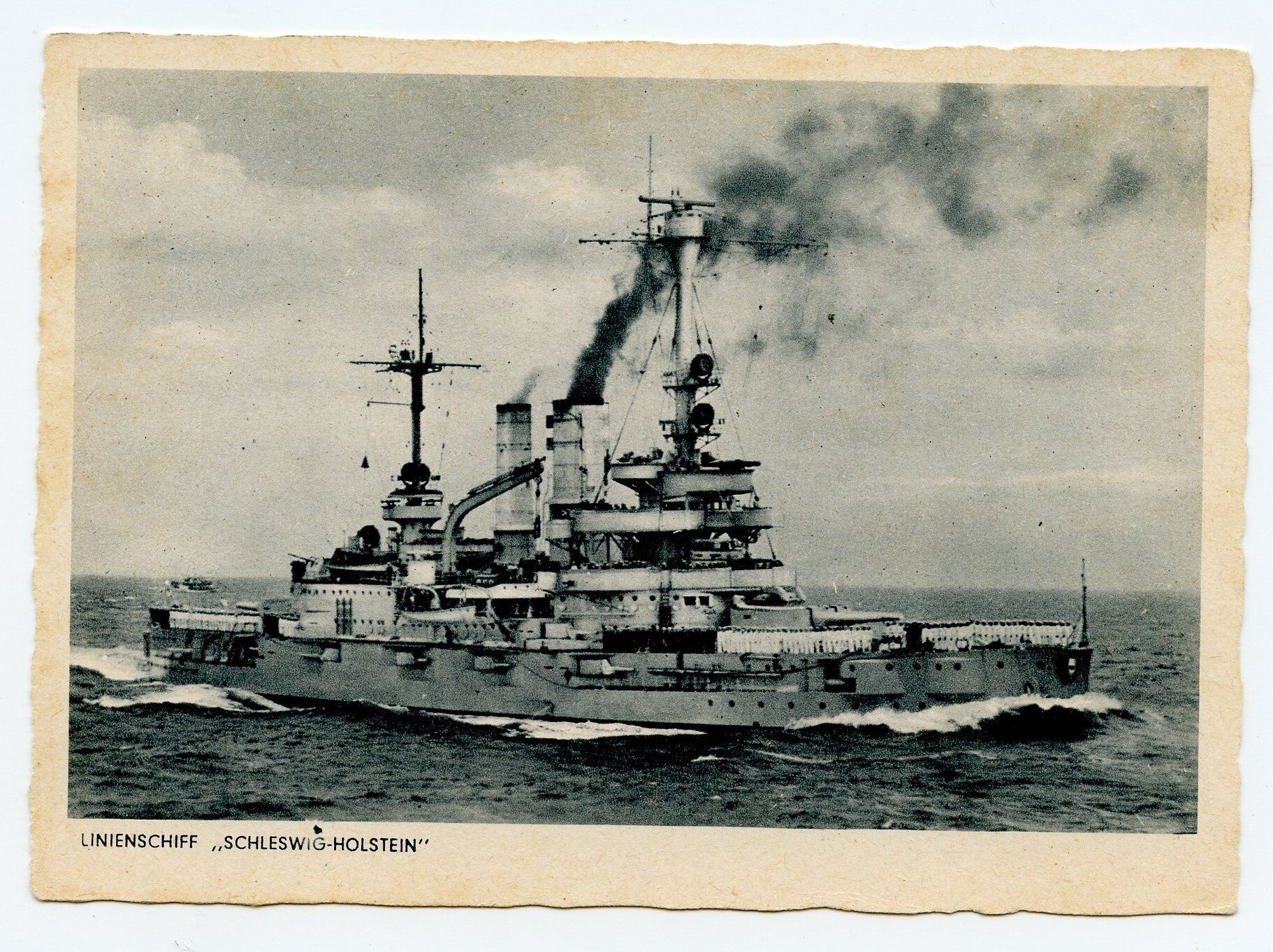 Very nice Postcard of the Kriegsmarine Linienschiff Schleswig-Holstein. Postcard size. Good clean condition and stamped on the reverse. No repairs, no damage.