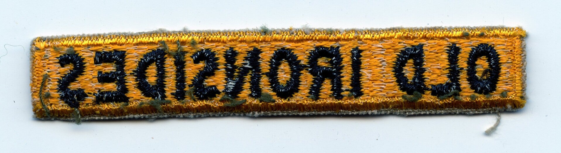 Nice WW2 original cut edge whiteback Old Ironsides Tab Patch. As used under the 1st Armored Division Patch. Great condition! No repairs, no damage.