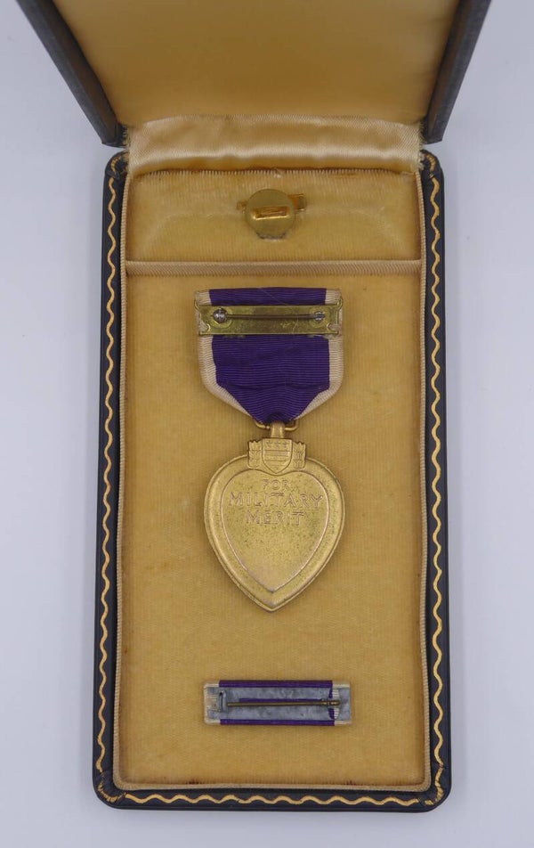An original complete WW2 numbered cased Purple Heart medal. The medal comes in its original case of issue together with its lapel pin and ribbon bar. The medal comes with a slot brooch mechanism, and is numbered on the left rim with "130779" indicating the Purple Heart was produced in 1942 by the Rex Products Company. The medal, ribbon bar and lapel pin are in excellent worn condition. The case remains in a good used condition. Excellent hard to find set in nice worn condition! No repairs, no damage.