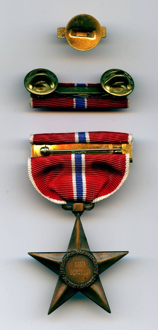 A very nice original WW2 Named Bronze Star medal. The bronze star medal comes with a crimp brooch mechanism and together with its ribbon bar with Valor and Oak Leaf devices. The Bronze Star Medal is machine engraved on the reverse with Cuesta McConnell Jr.. Cuesta served with the 410th Field Artillery Group Headquarters Battery and took at least part in the Normandy Campaign and Battle of the Bulge. The Bronze Star already comes with some research but there is definitely more to find out about Cuesta. Excellent interesting Bronze Star set with lots of research potential! No repairs, no damage.