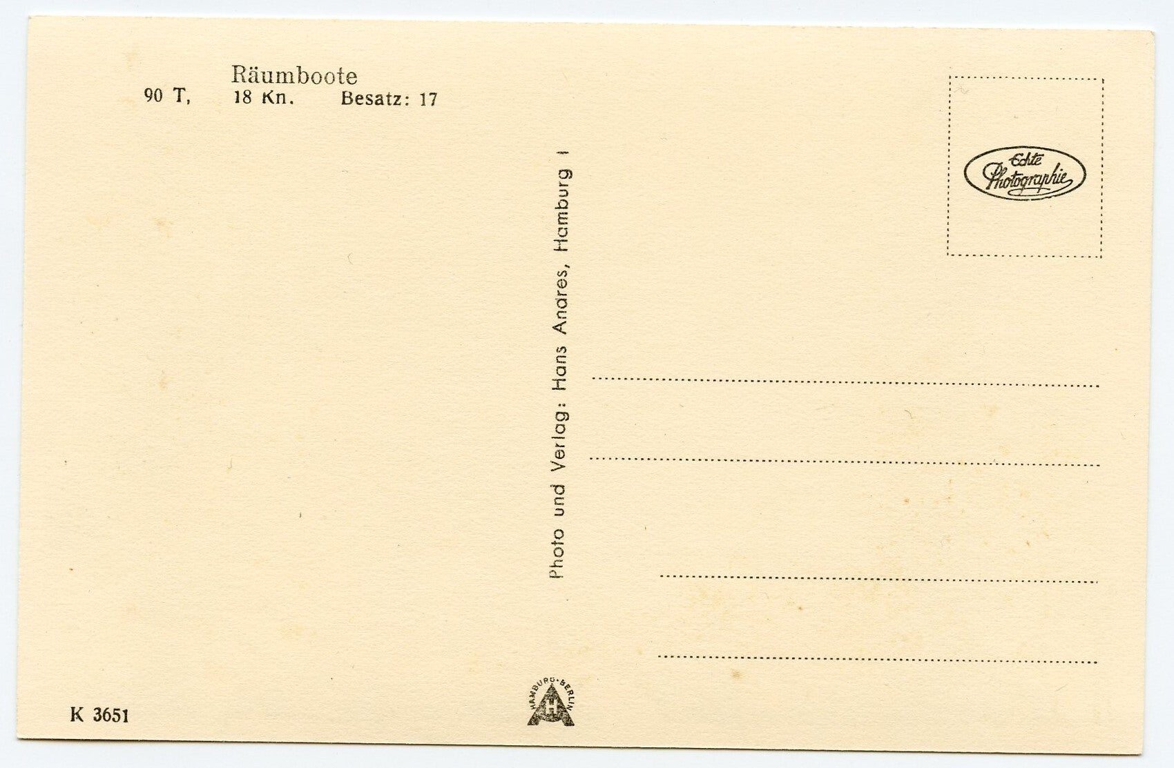 Very nice Postcard of the Kriegsmarine depicting a Räumboote. Postcard size. Excellent clean condition. No repairs, no damage.