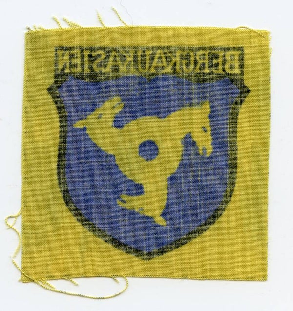 Very nice printed "Bergkaukasien" Volunteer Shield. The shield is a typical late war 3rd and printed type. The shield was worn by volunteers who originated from the Caucasus whom served within the Caucasian-Mohammedan Legion. The shield remains in a mint and unissued condition. TOP PIECE! No repairs, no damage.