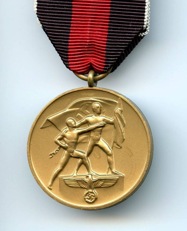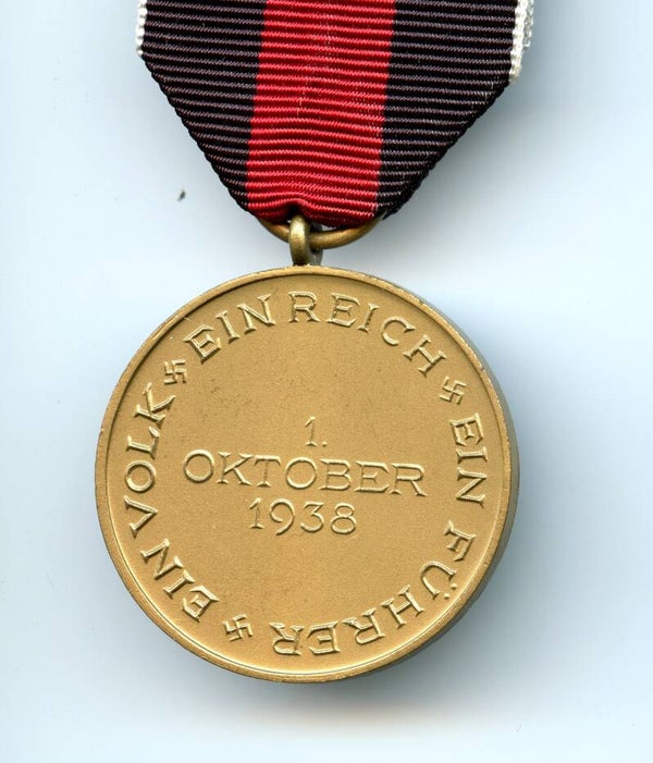Nice 1 October 1938 medal for the annexation of Sudetenland. Buntmetall construction. Medal comes with its piece of ribbon. Nice medal in near mint condition. No repairs, no damage.