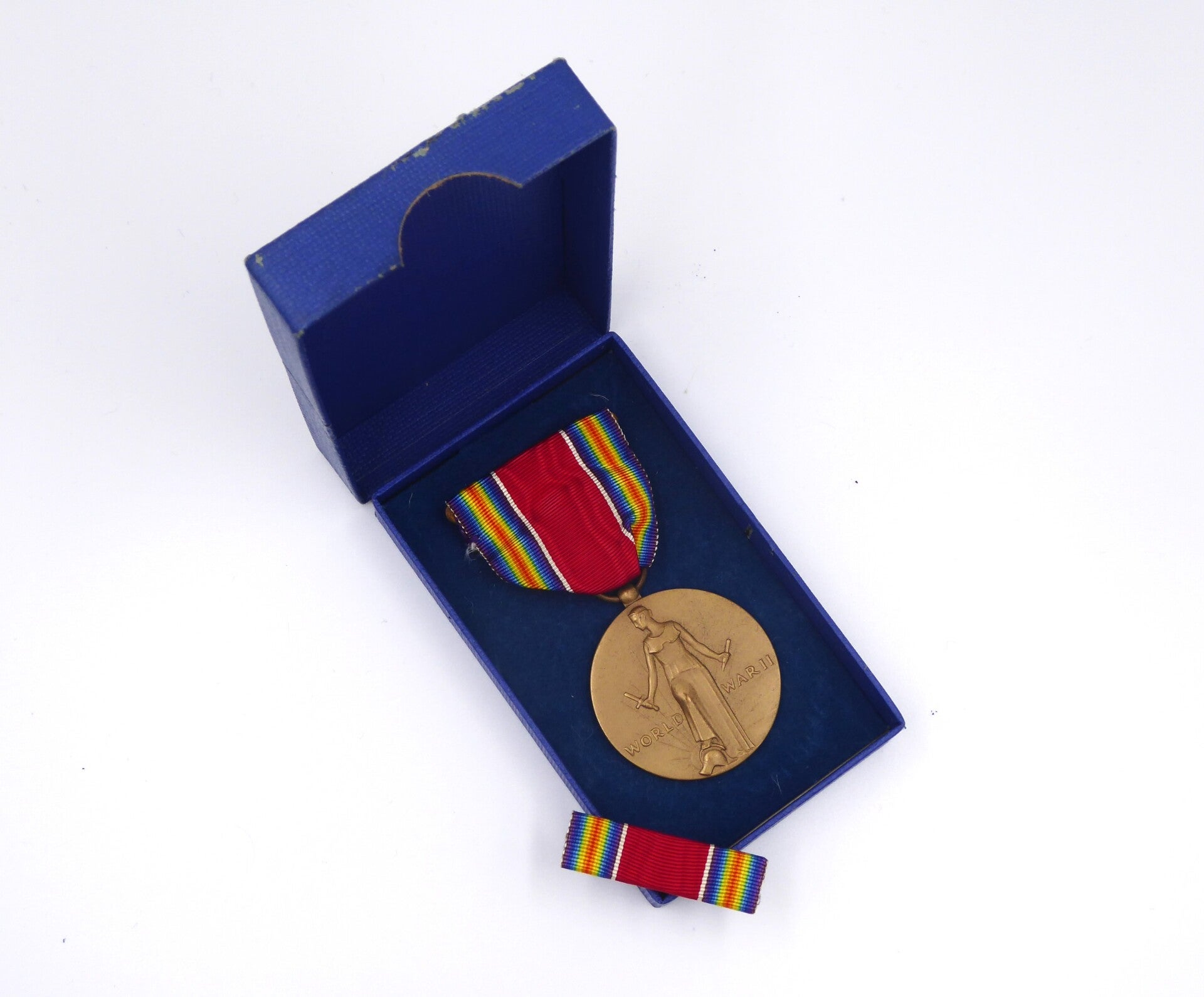 Nice WW2 original Victory Medal in box. The medal comes with its period original slot brooch mechanism indicating period production. The medal comes in its original blue box of issue together with its original ribbon bar.The box has some wear to it. The medal is otherwise in near mint condition. Nice interesting set in great condition! No repairs, no damage.