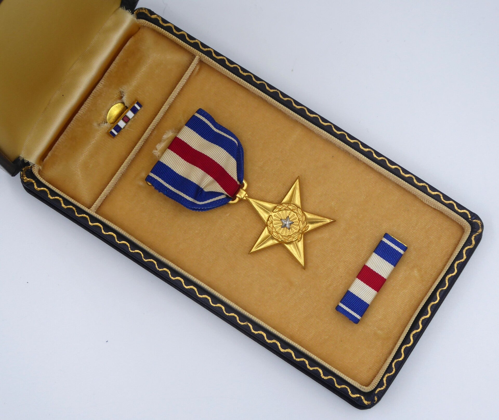 An original complete WW2 cased Silver Star medal. The medal comes in its original metal case of issue together with its ribbon bar and lapel pin. The medal comes with a slot brooch mechanism and its original ribbon, indicating production during WW2. Excellent set in near mint condition! No repairs, no damage.