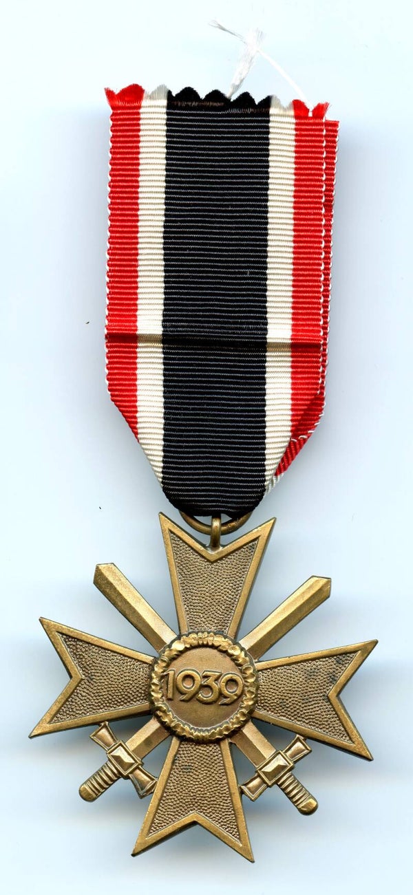 KVK 2nd Class with Swords, unmarked. Tombac construction. Nice cross in worn condition, comes with its original ribbon. Very nice worn cross! No repairs, no damage.