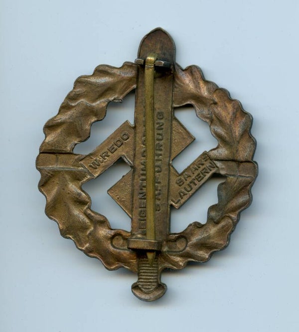 Nice original SA sports badge in bronze produced by Werner Redo, Saarlautern. The badge is made out of a steel construction and comes with its original soldered on set up. The badge is Redo maker marked on the back. Nice SA Sports Badge with some minor wear and great patina to it. No repairs, no damage.