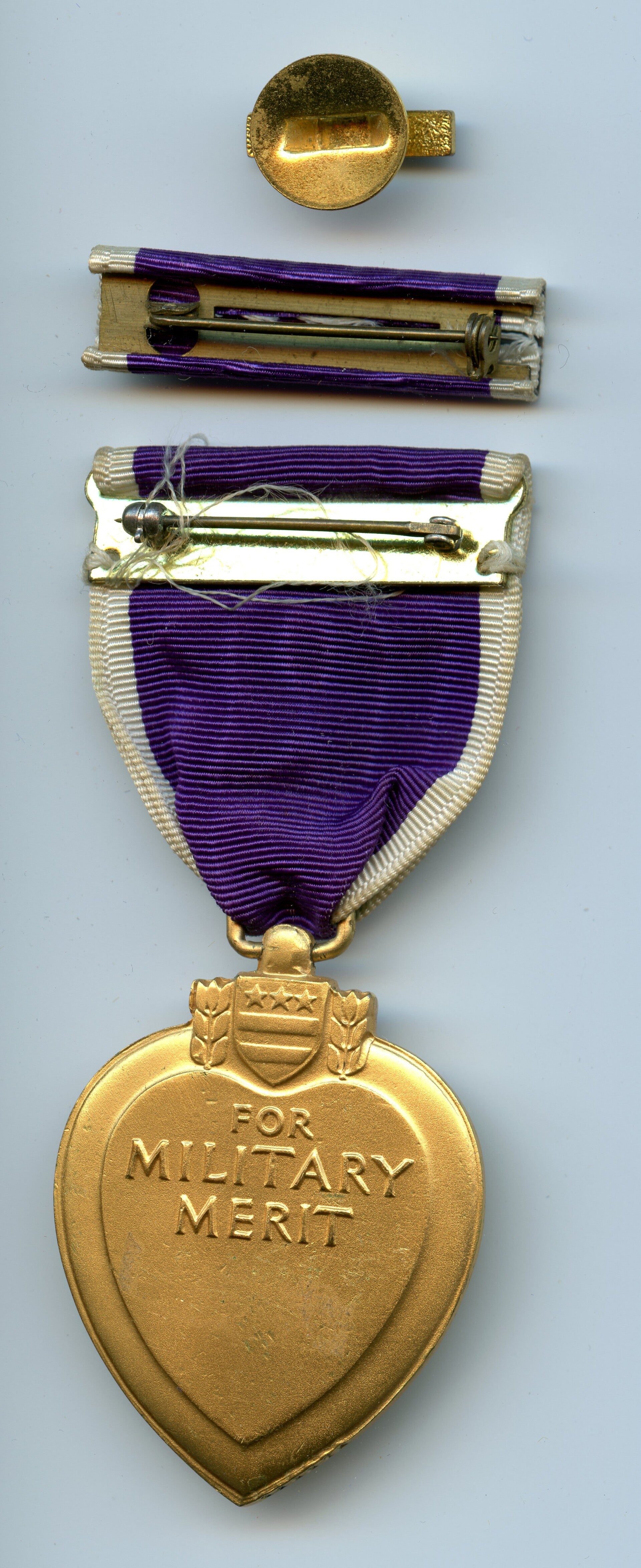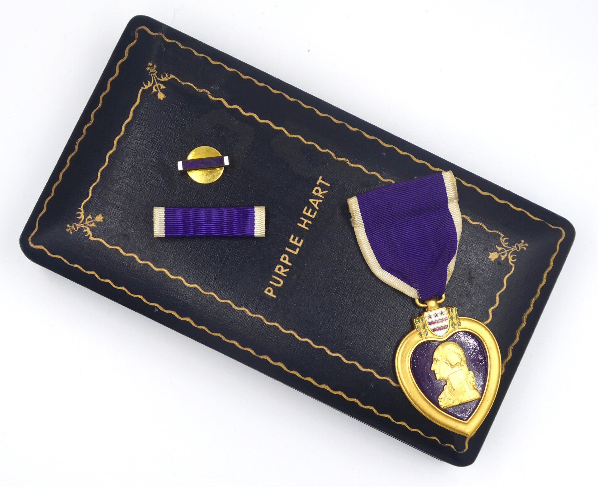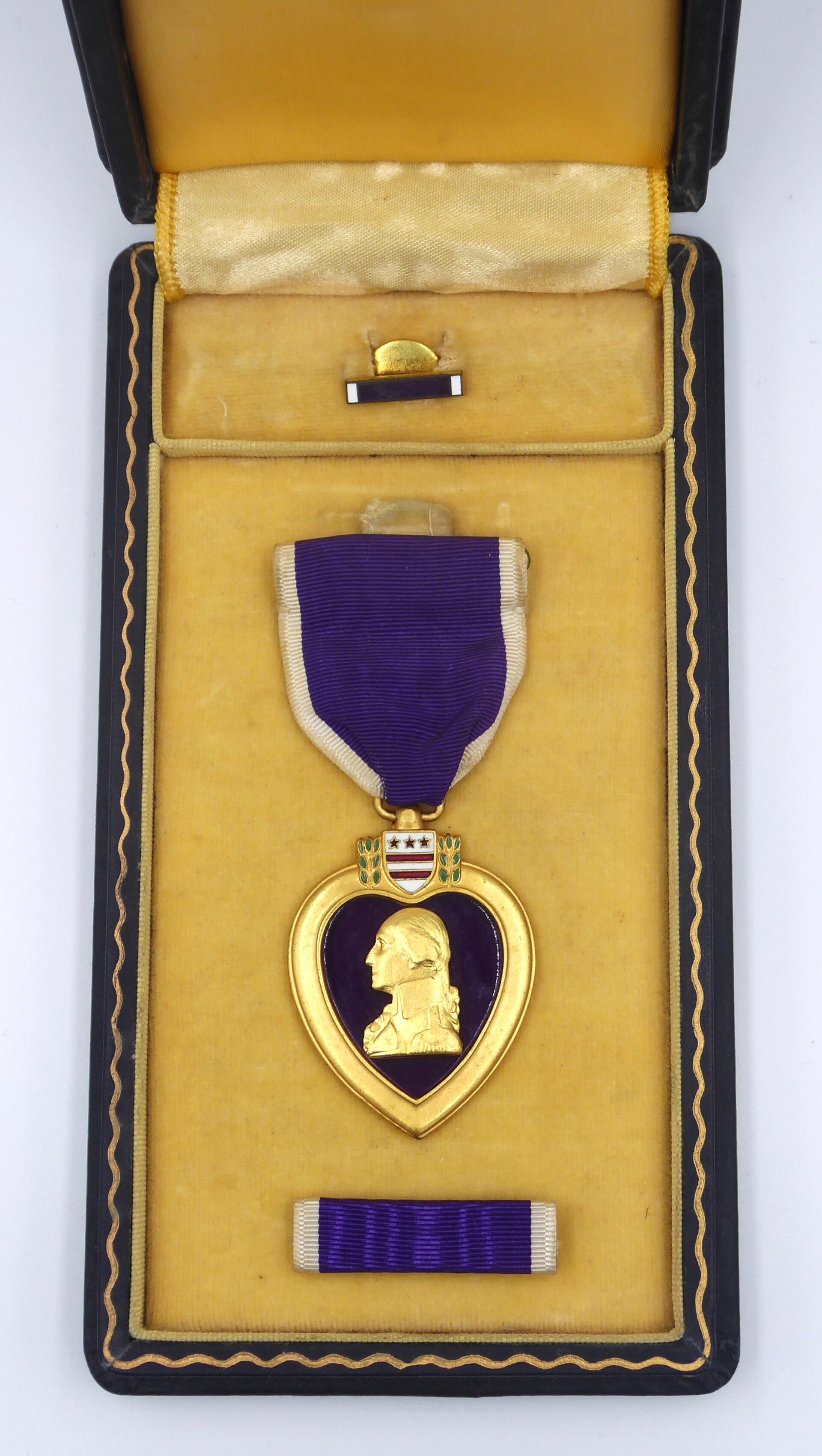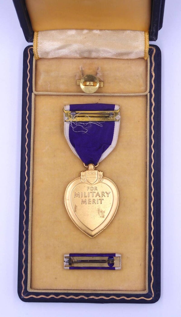 An original complete WW2 numbered cased Purple Heart medal. The medal comes in its original hard to find early wooden case of issue together with its lapel pin and ribbon bar. The medal comes with a slot brooch mechanism, and is numbered on the left rim with "318832" indicating the Purple Heart was produced in 1942 by the Rex Products Company. The medal, ribbon bar and lapel pin are in excellent worn condition. The case remains in a very good condition. Excellent hard to find early Purple Heart set in nice worn condition! No repairs, no damage.