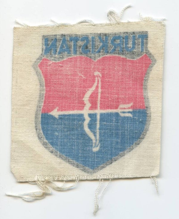 Very nice printed "Turkistan" Volunteer Shield. The shield is a typical 2nd Pattern late war 3rd and printed type. The shield was worn by Eastern Volunteers whom served within the Turkistan Legion. The shield remains in a great and unissued condition. TOP PIECE! No repairs, no damage.