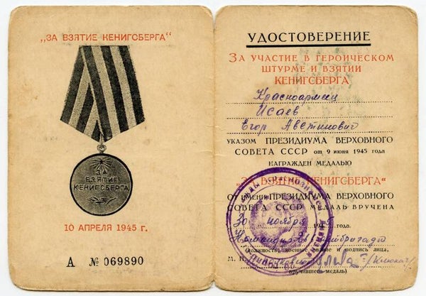 Very nice original medal for the Capture of Königsberg with document. The medal comes with its original ribbon and double layer steel suspension. The medal is of the first type and remains in a great worn condition! Nice medal for the Capture of Königsberg with no repairs, no damage. The document is numbered 069890 and awarded on the 30th of November 1945. The medal and document have been awarded to Red Army Soldier Egor Isaev Avetinovid. Nice original document. Great one of a kind set!