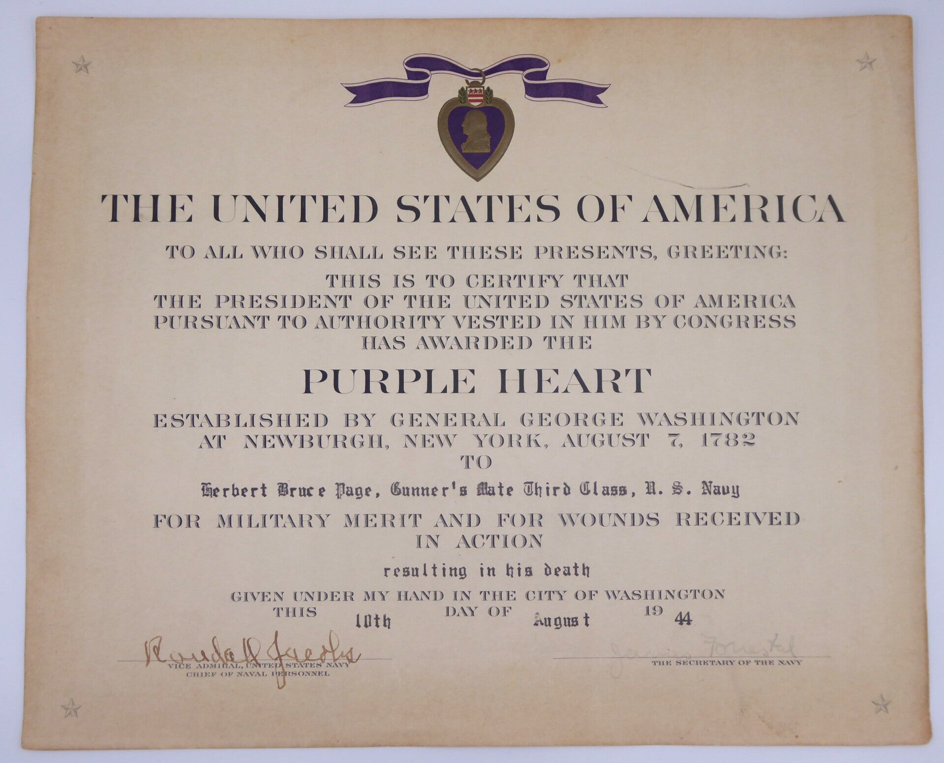Very nice and interesting WW2 KIA Purple Heart document. The document is named to Gunner's Mate Third Class Herbert Bruce Page, crew member of the USS Barton. Page was KIA on the 13th of November 1942 during the First Naval Battle of Guadalcanal. During this battle the USS Barton got torpedoed and sank by the Japanese Destroyer Amatsukaze. Page was among the 164 crew members of the USS Barton that lost their lives that day. The Purple Heart award certificate was awarded on the 10th of August 1944. The award certificate remains in a good condition as can be seen on the photos. No repairs, no damage.