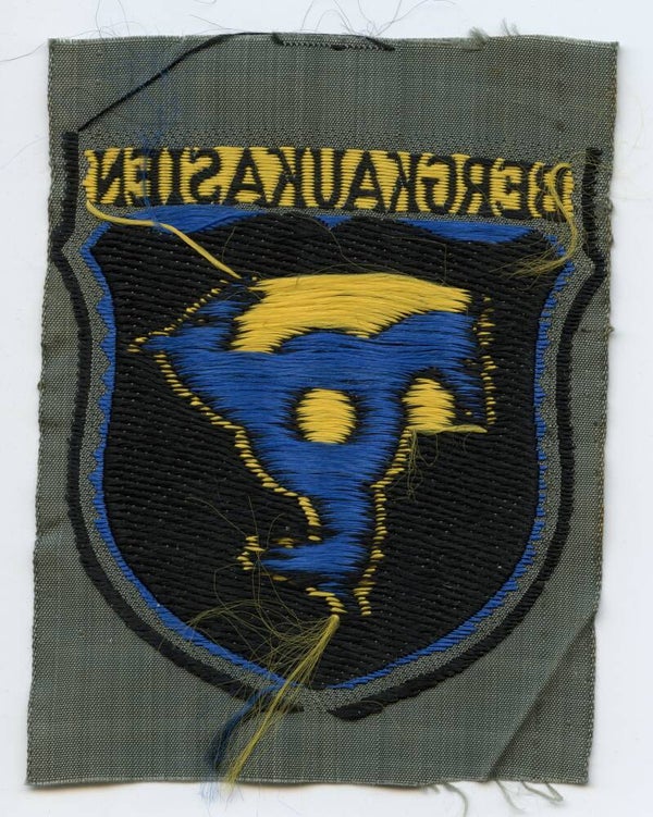 Very nice BeVo woven "Bergkaukasien" Volunteer Sleeve Shield. The shield is a typical eary war type. The shield was worn by volunteers who originated from the Caucasus whom served within the Caucasian-Mohammedan Legion. The shield remains in a mint and unissued condition. TOP PIECE! No repairs, no damage.
