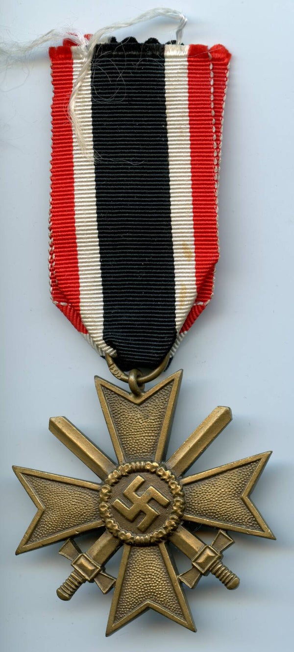 Nice KVK 2nd Class with Swords produced by Rudolf Tham, Gablonz an der Neiße. Tombac construction. The cross is marked on the ring with "101" indicating production by Tham. Nice cross in worn condition, comes with its original ribbon. Great cross! No repairs, no damage.