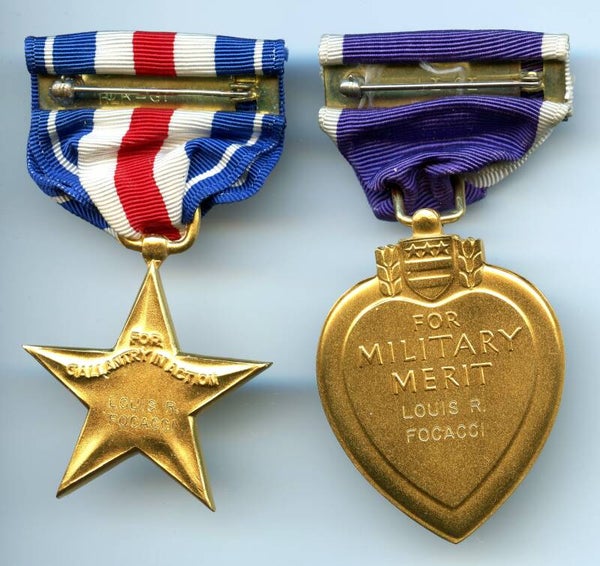 WW2 original named "replacement" Purple Heart & Silver Star Medal Set. The medals remain in great condition. The medals come with together with ribbon bar and lapel pin and have a period original crimp brooch mechanism. Both the Purple Heart and Silver Star are name engraved to Louis R. Focacci, serving in the European Theater of War as a member of the 6th Armored Division. The set remains in excellent condition! No repairs, no damage.