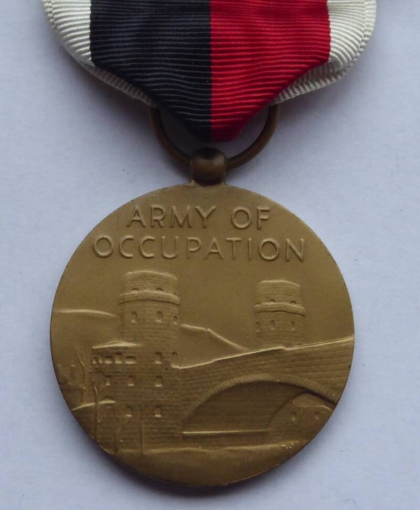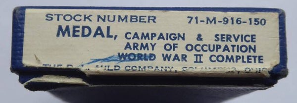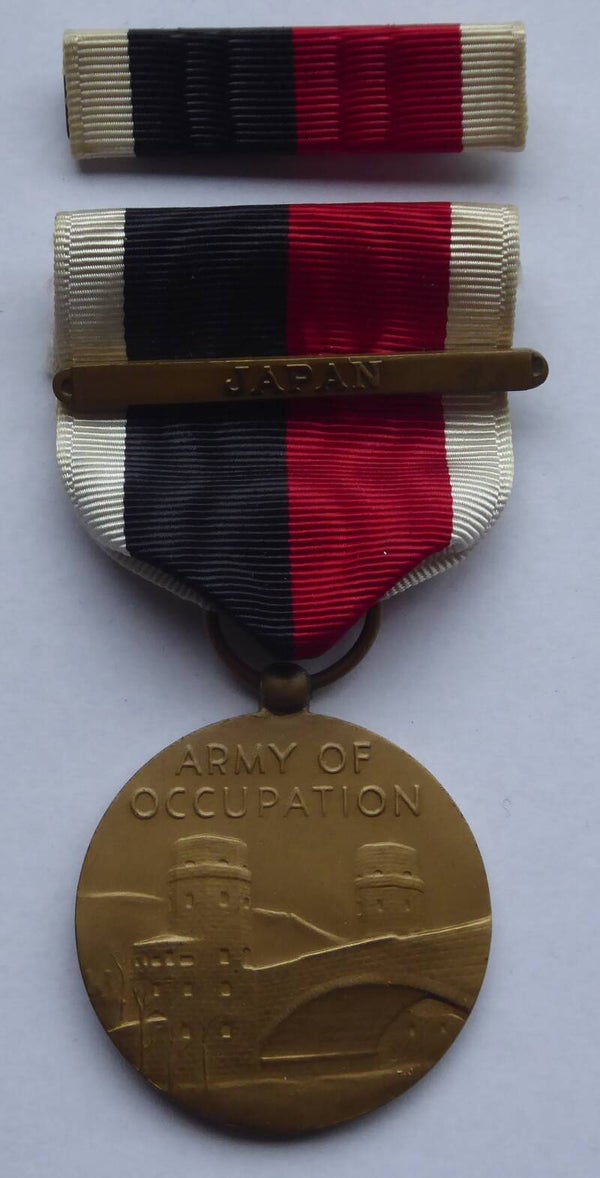 Nice original and complete WW2 Occupation Medal with Japan clasp and ribbon bar. The occupation medal and ribbon bar come in its original blue box of issue, which has some wear to it. The medal and ribbon bar both remain in an excellent near mint condition. The medal contains the crimp brooch mechanism and has the Japan clasp attached to its ribbon. Great complete set! No repairs, no damage.