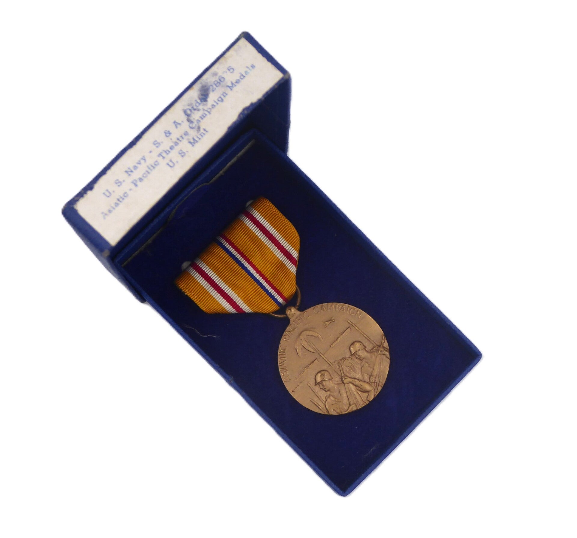 Nice WW2 original Cased Asiatic Pacific Campaign Medal. The medal comes in its original blue box of issue, which remains in good condition. The medal comes with a crimp brooch mechanism. Great set! No repairs, no damage.