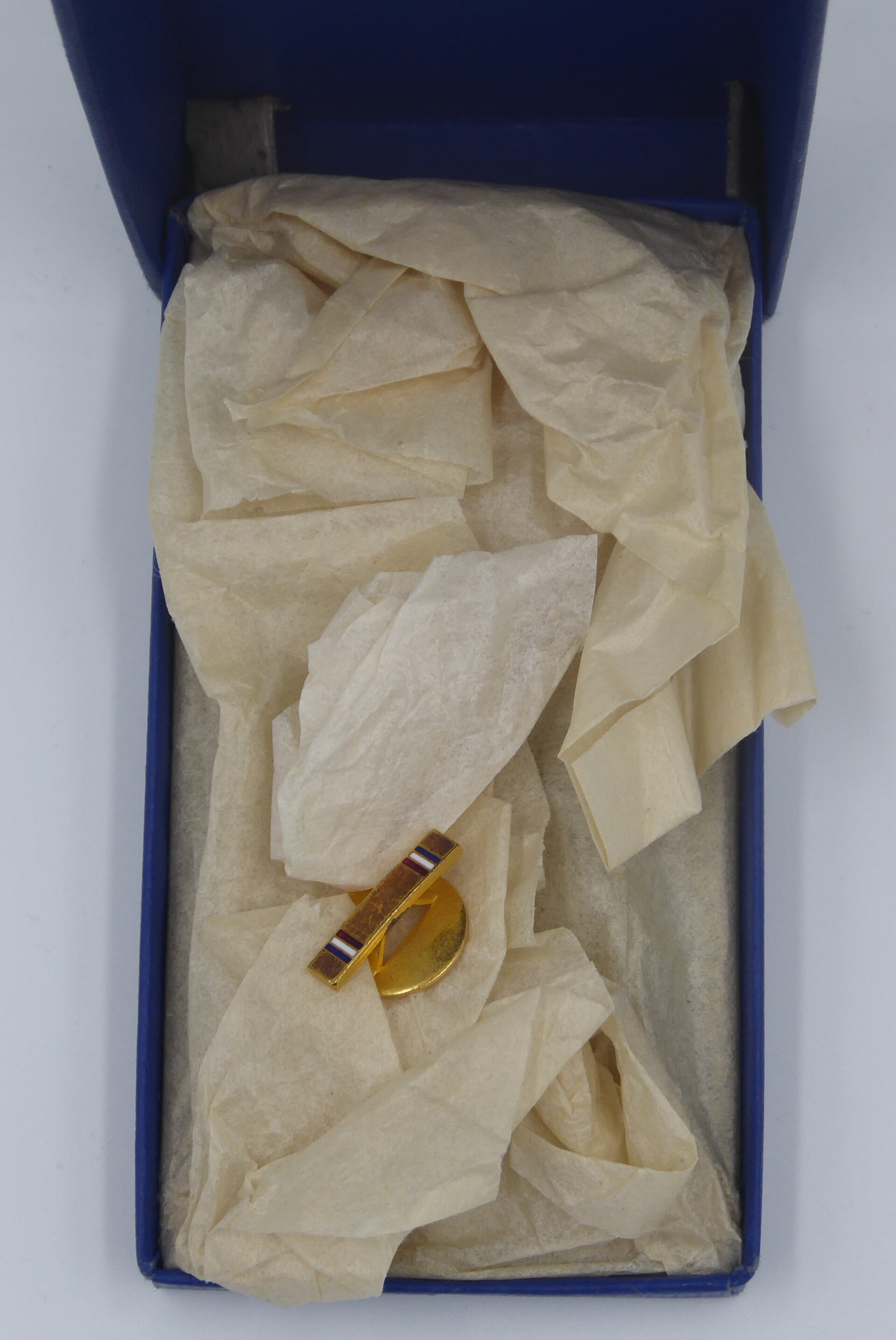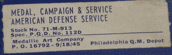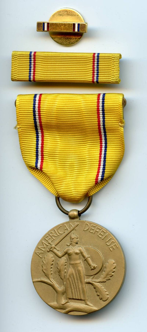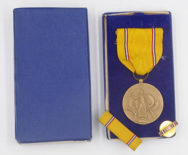 WW2 original Cased American Defense Medal. The medal comes together with ribbon bar and lapel pin in its original blue box of issue, which has some wear to it. The medal has a slot brooch mechanism and remains in an excellent near mint condition. Great complete set! No repairs, no damage.