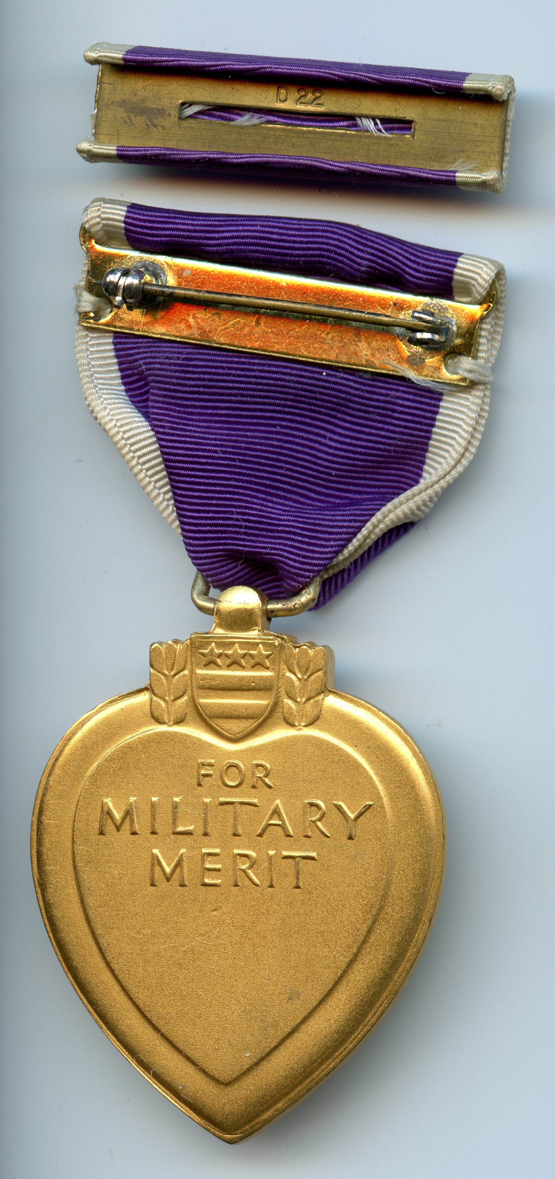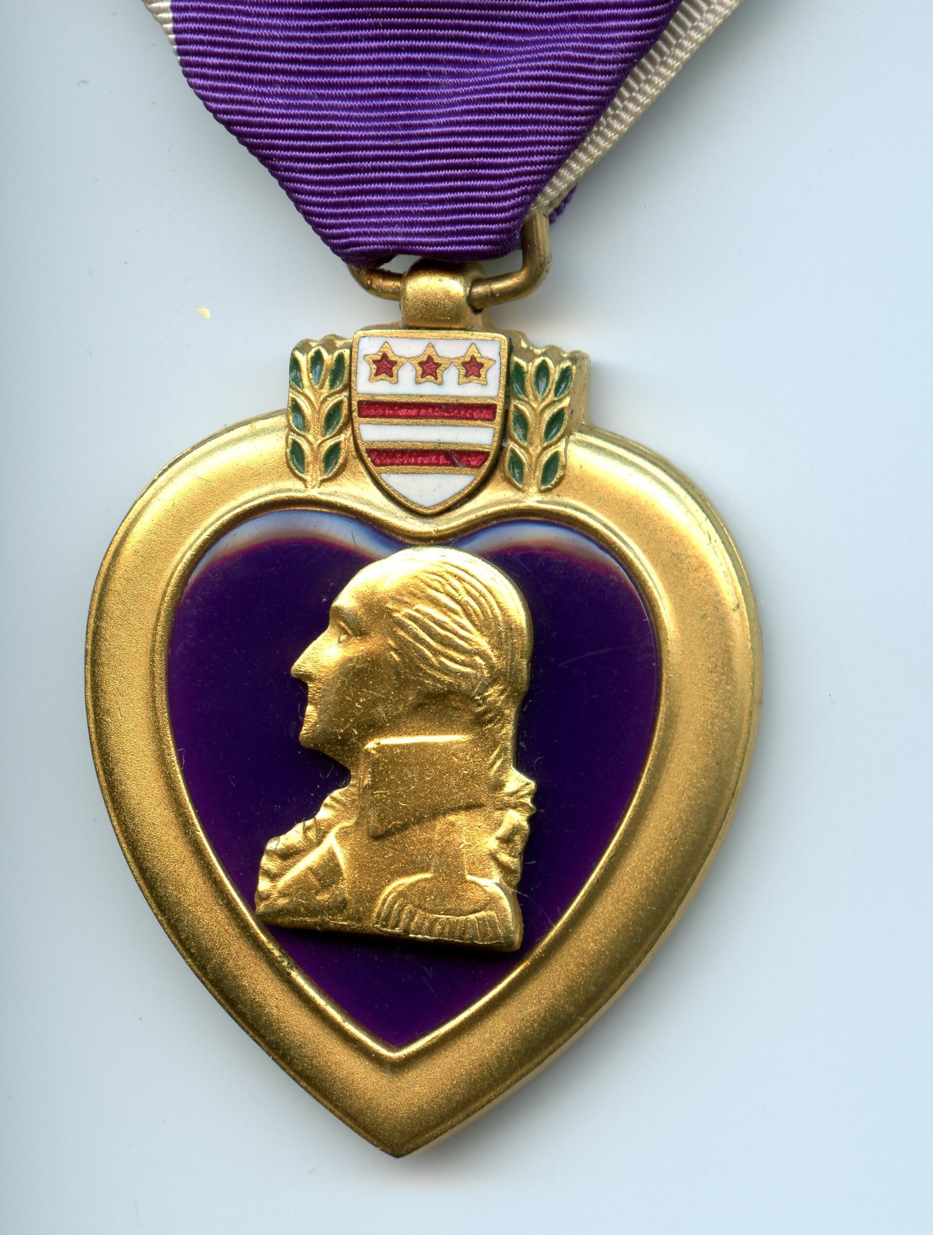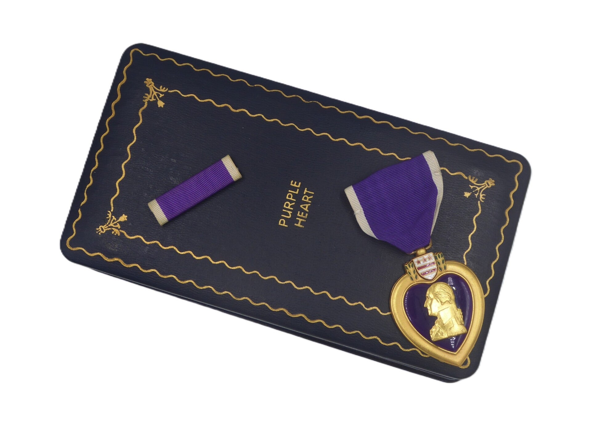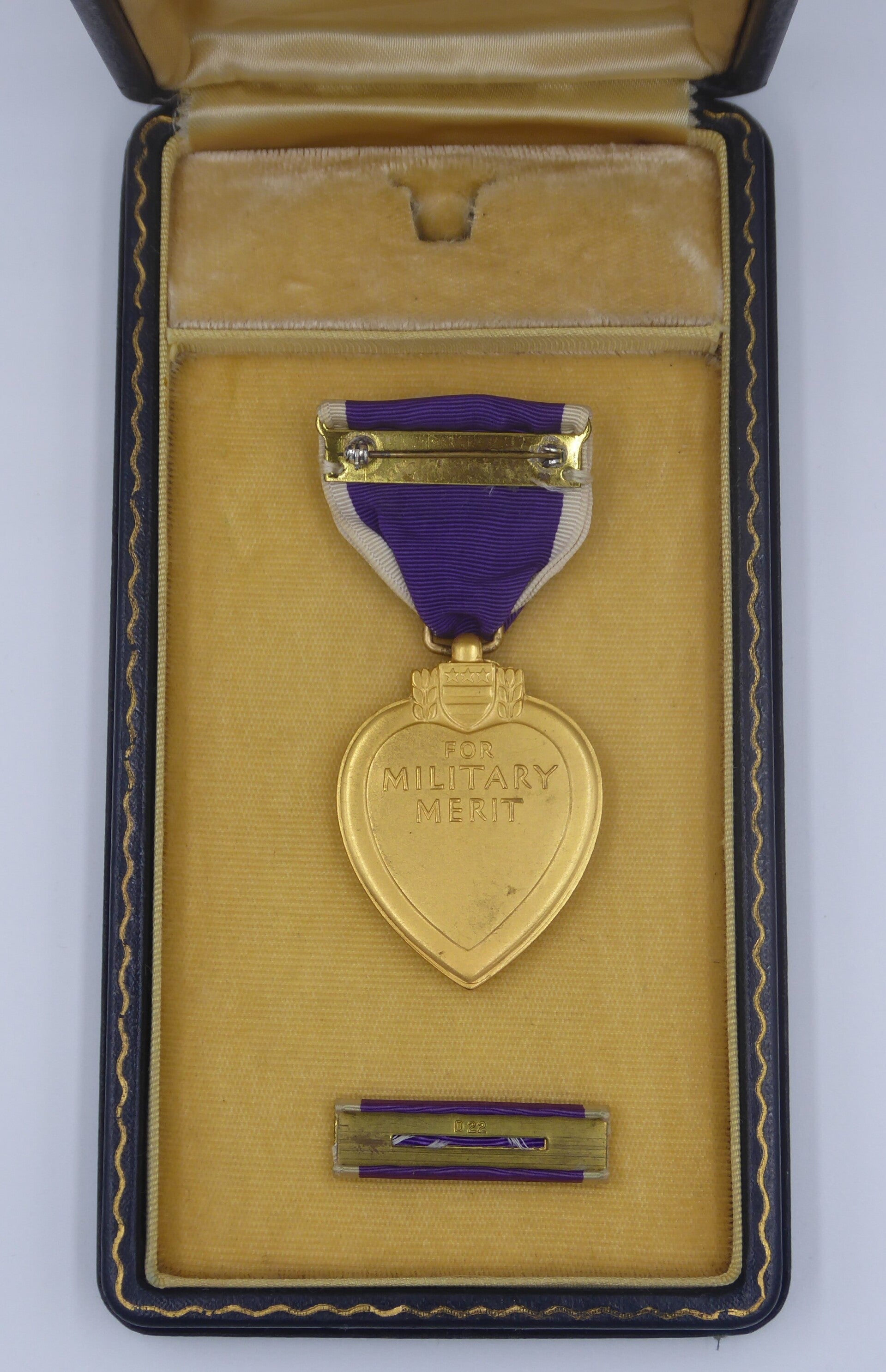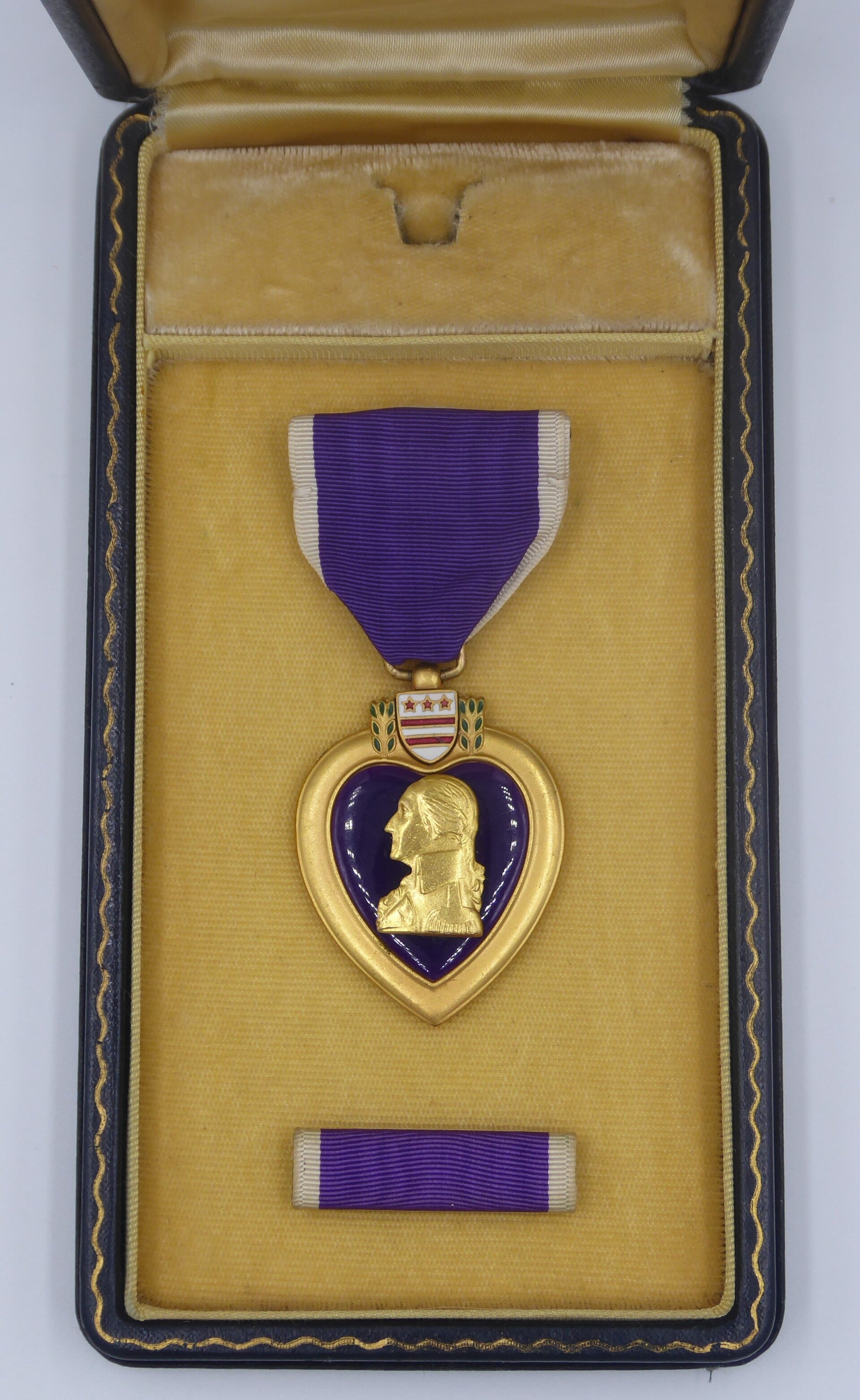 An original WW2 cased Purple Heart medal. The medal comes in its original case of issue together with its ribbon bar. The medal comes with a slot brooch, indicating production during WW2. Great set in great condition! No repairs, no damage.
