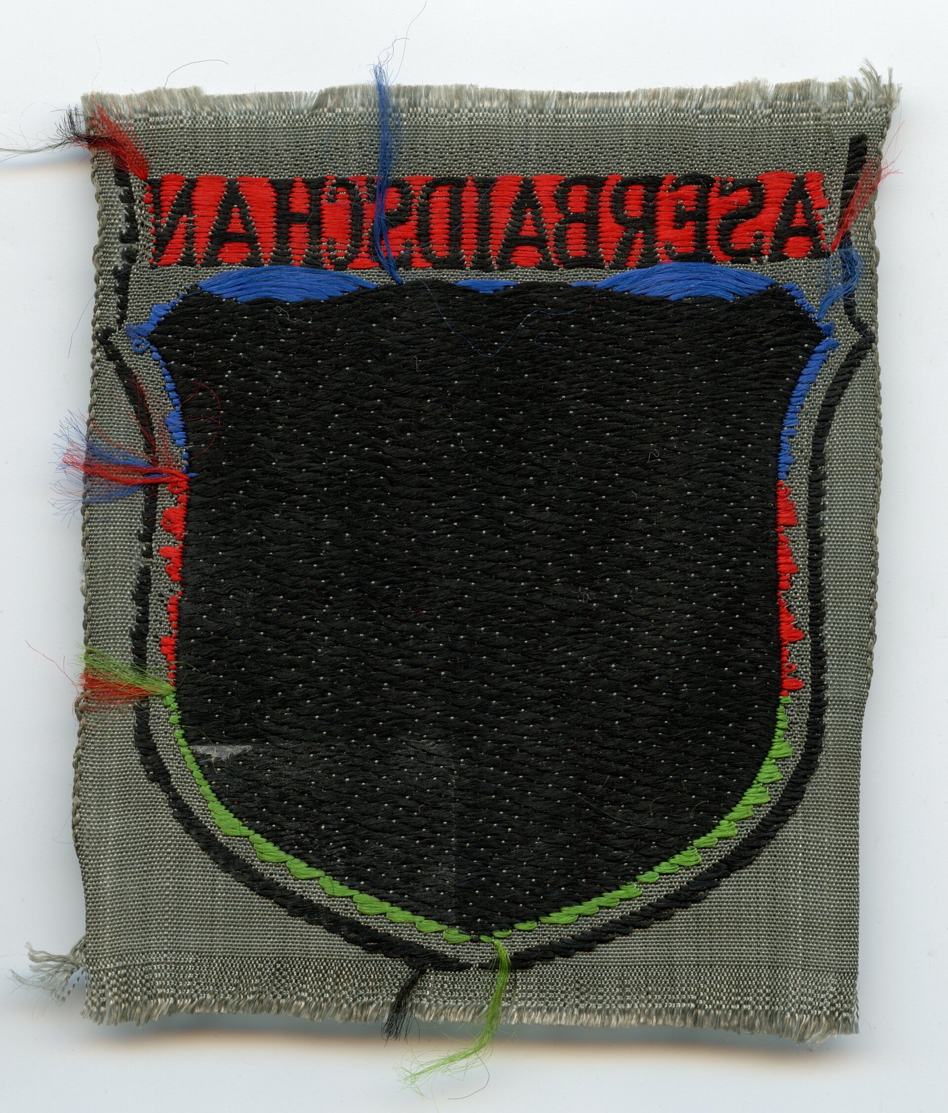 Very nice BeVo woven "Aserbaidschan" Volunteer Shield. The shield was worn by Azerbaijani nationals whom served within the Aserbaidschanische Legion. The shield remains in a good and unissued condition. No repairs, no damage.