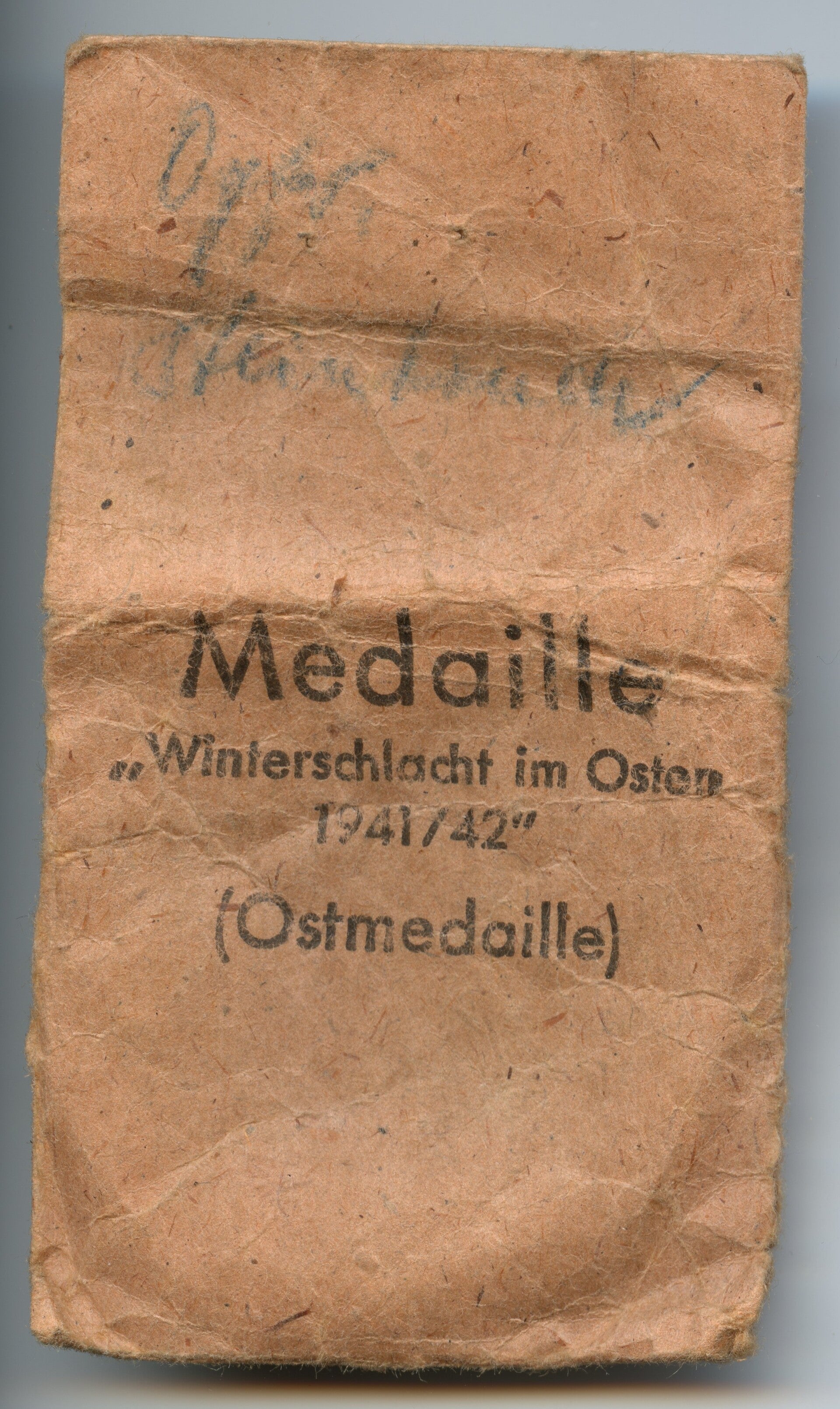 Nice original East Front medal with pouch, produced by Moritz Hausch AG, Pforzheim. The medal comes with its original piece of ribbon and pouch, which is marked "Moritz Hausch A.G. Pforzheim". The medal is also maker marked with PKZ code "127" on the ring. Nice original matching set in good worn condition! No repairs, no damage.