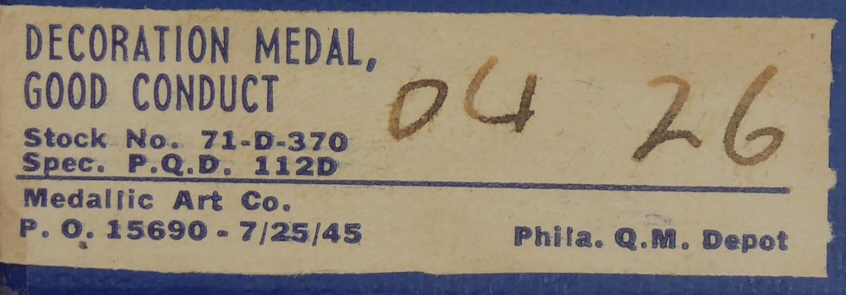 WW2 original Cased Good Conduct Medal. The set was produced in 1945 by the Medallic Art Company. The medal comes in its original box of issue, which remains in good condition. The medal has a slot brooch mechanism and remains in an excellent near mint condition. Great Good Conduct set! No repairs, no damage.