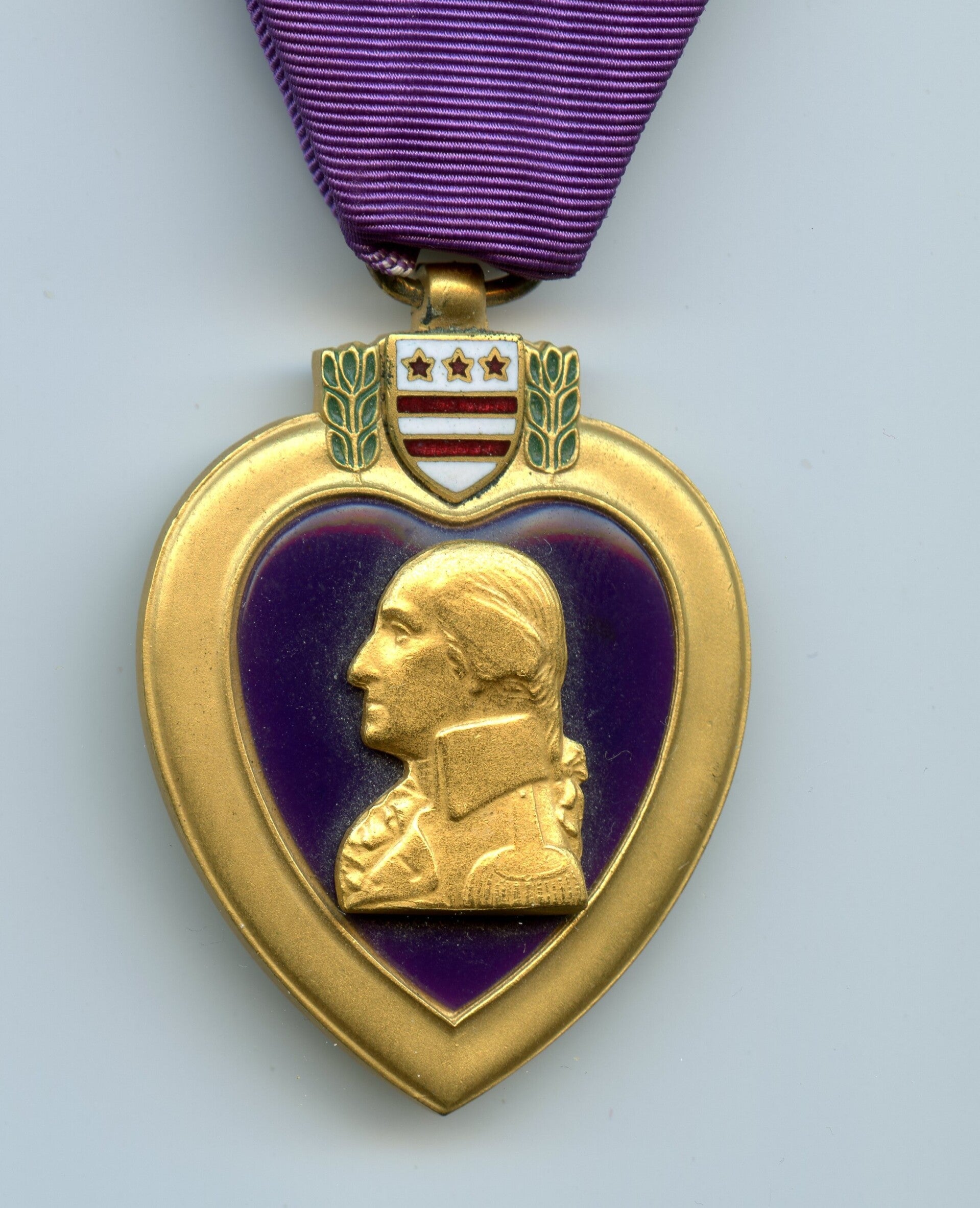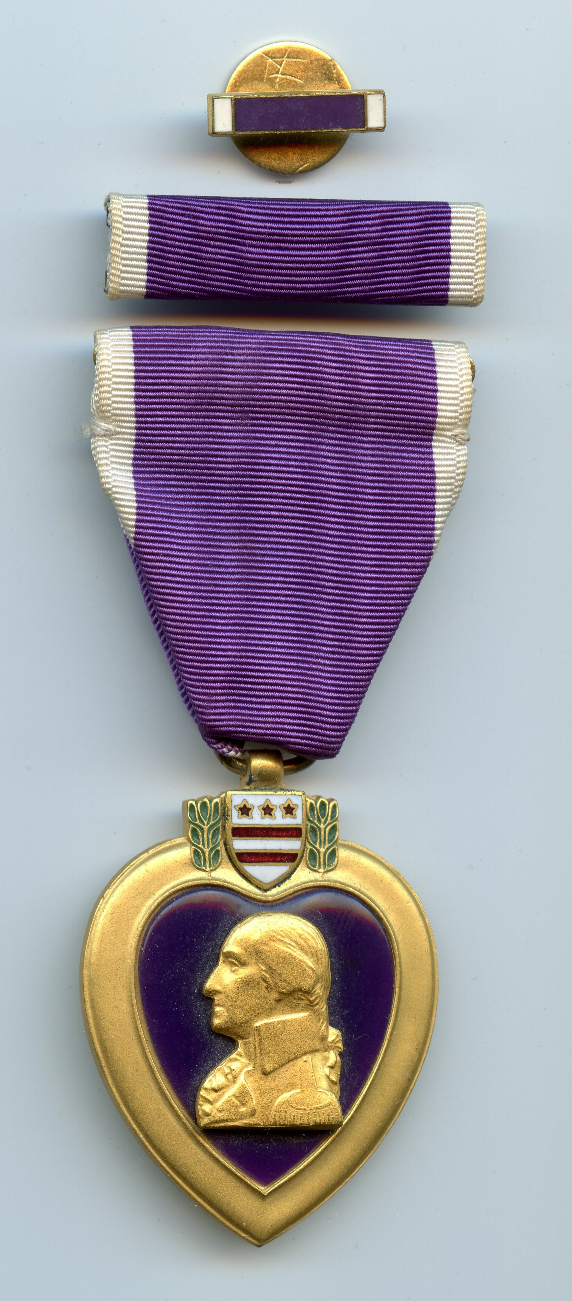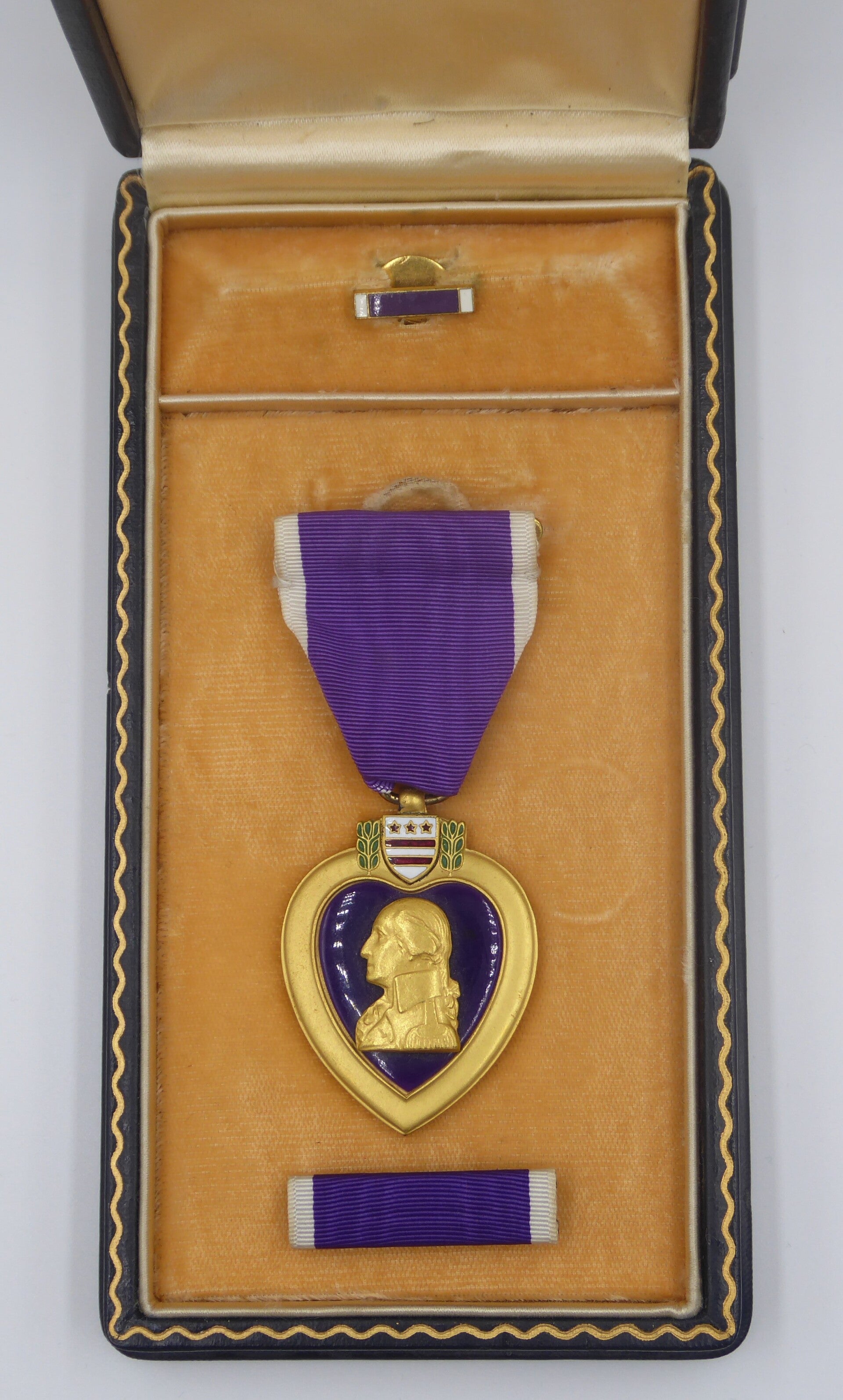 An original complete WW2 cased Purple Heart medal. The medal comes in its original case of issue together with its ribbon bar and lapel pin. The medal comes with a slot brooch, indicating production during WW2. Great set in great condition! No repairs, no damage.