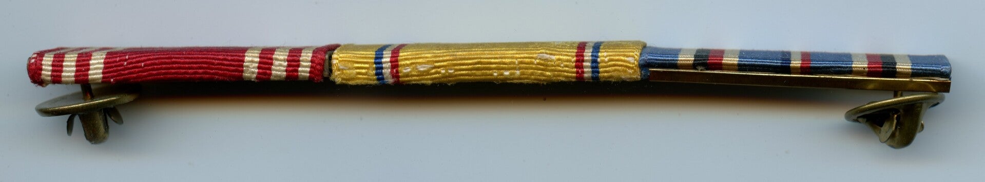 Nice WW2 US Ribbon Bar for the Good Conduct, American Defense and American Navy Campaign Medal. The ribbon bar remains in an excellent shape. Very nice ribbon bar! No repairs, no damage.
