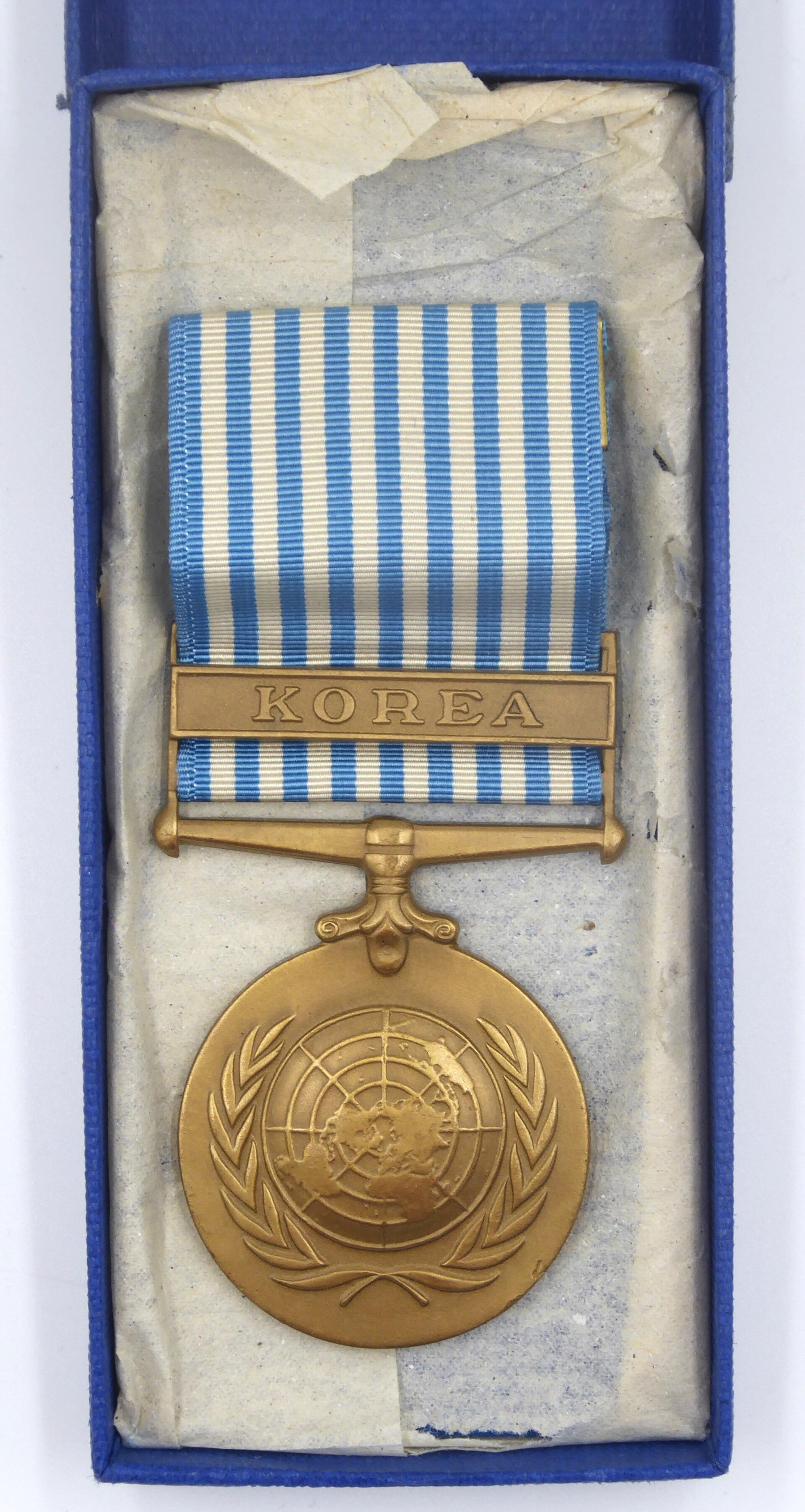 Nice Post WW2 Cased United Nations Service Medal for Korea. The medal comes in its original blue box of issue and remains in near mint condition. The medal comes with a period original crimp brooch mechanism. Great looking set! No repairs, no damage.