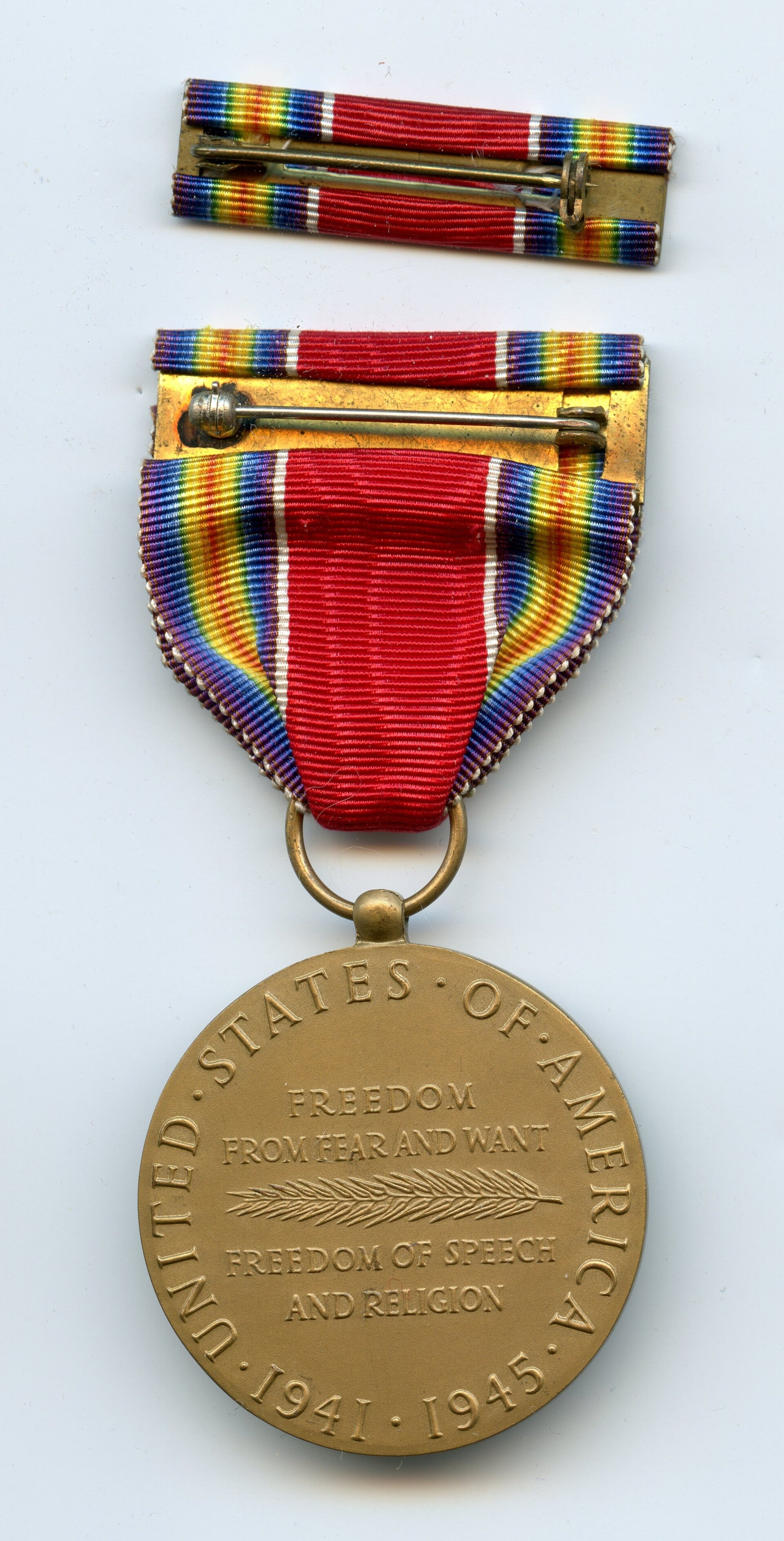 Nice WW2 original Victory medal and ribbon bar. The medal comes with its period original crimp brooch. The medal and ribbon bar remain in good condition. Great set! No repairs, no damage.