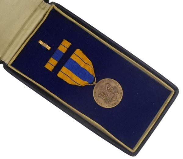 An original WW2 cased Selective Service Medal. The medal comes in its original case of issue (which has some wear to it) together with its ribbon bar. The medal comes with a slot brooch, indicating production during WW2. Great set in good condition! No repairs, no damage.