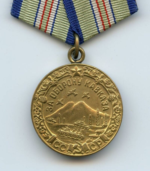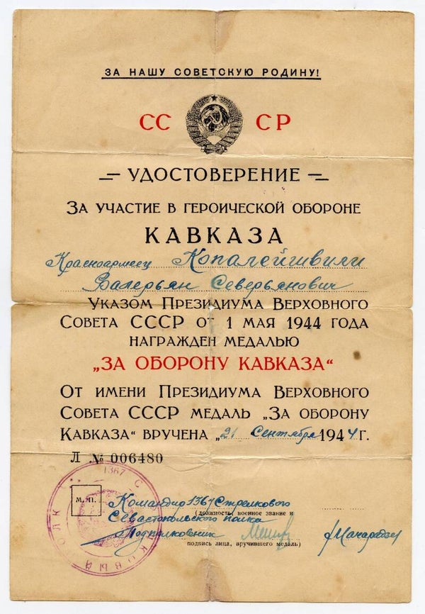 Very nice original medal for the Defense of the Caucasus and document. The medal comes with its original double brass suspension. The medal is of the first type and remains in a great condition! Nice medal for the Defense of the Caucasus with no repairs, no damage. The document is numbered 6480 and awarded in the field on the 21st of September 1944. The medal and document have been awarded to Red Army Soldier Valerian Severyanovich Kopaleishvili. Nice original document with no repairs, no damage. Great one of a kind set!
