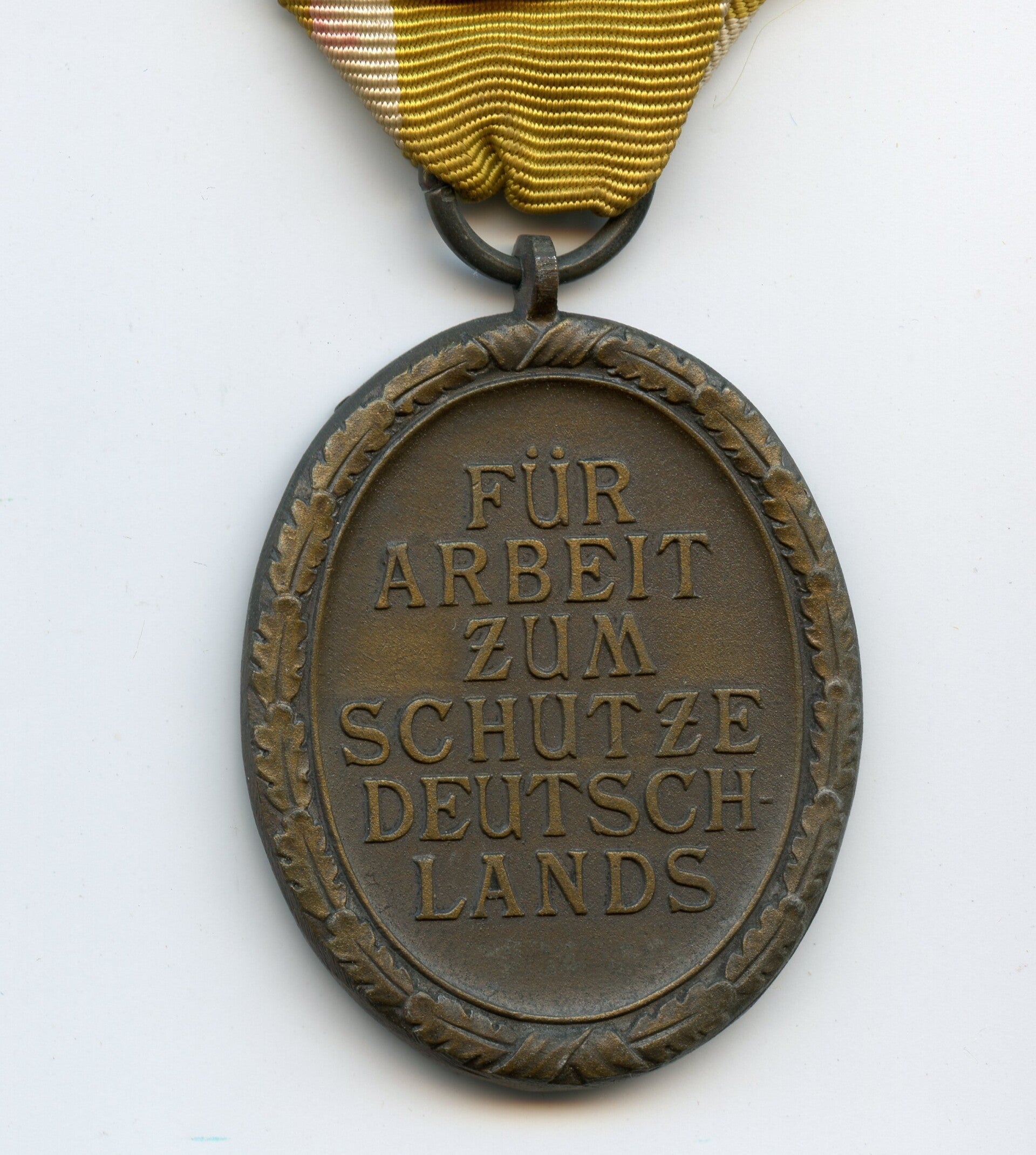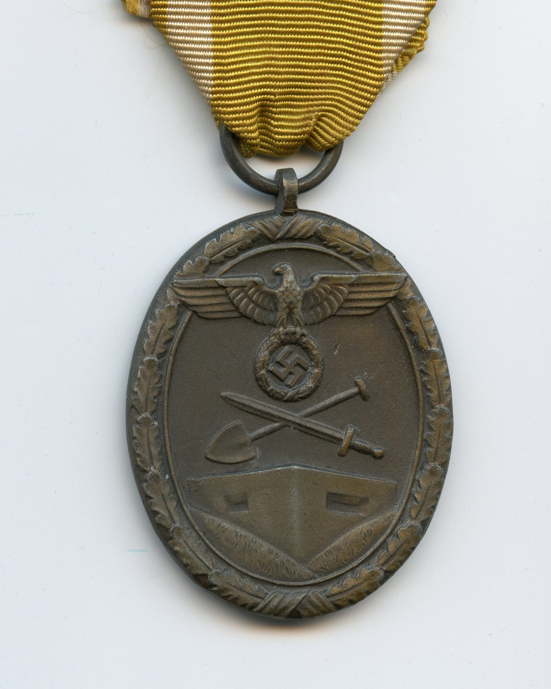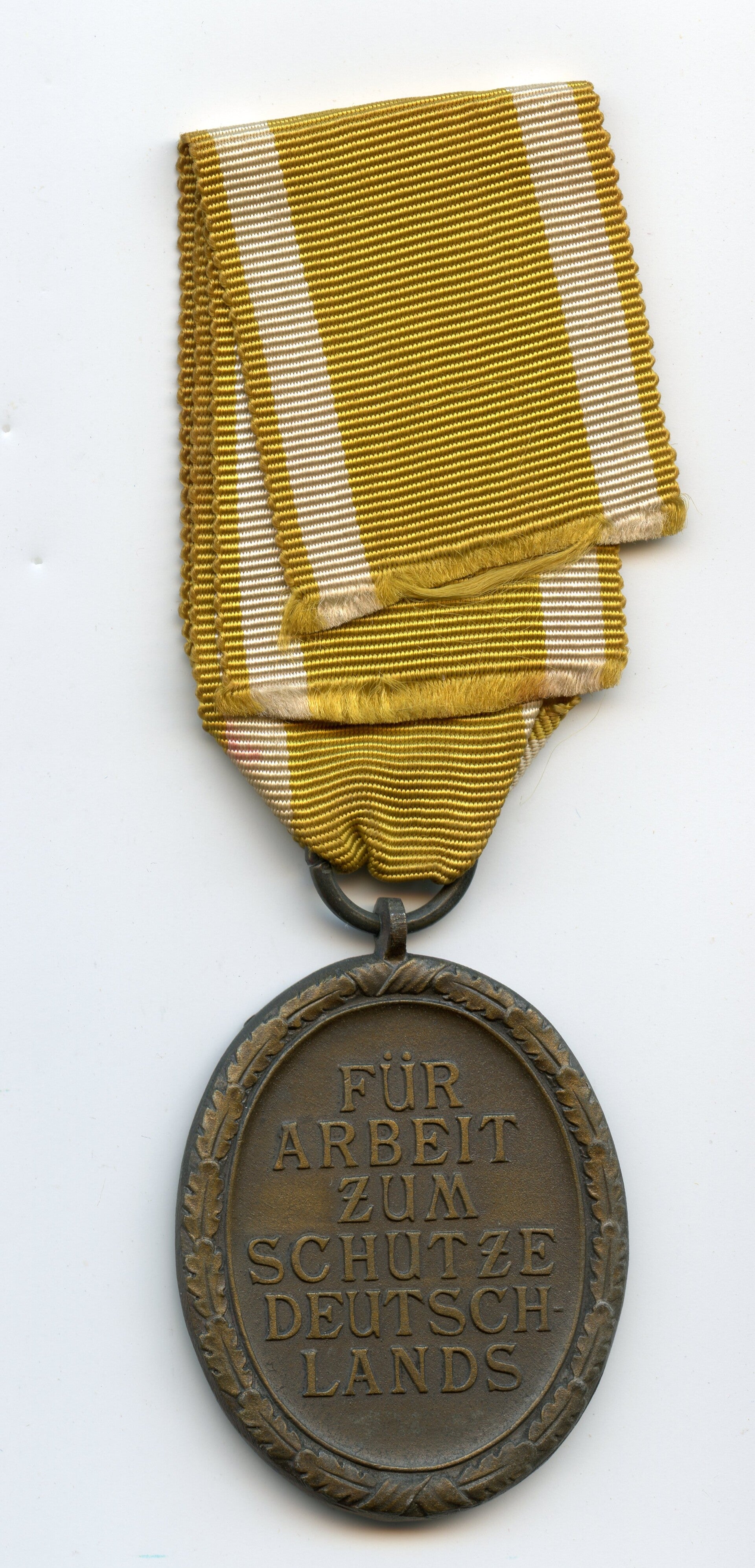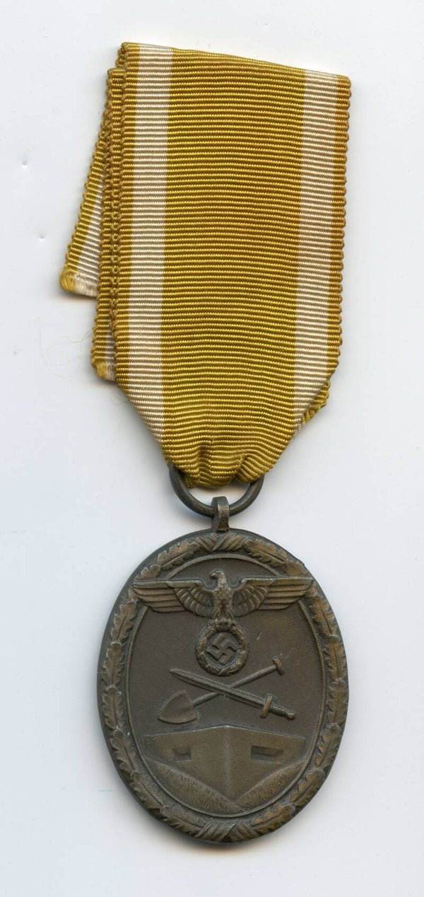 Excellent original Westwall medal. The medal is made out of tombac and has a very nice patina. The medal comes with its original matching ribbon. Excellent Westwall medal! No repairs, no damage.