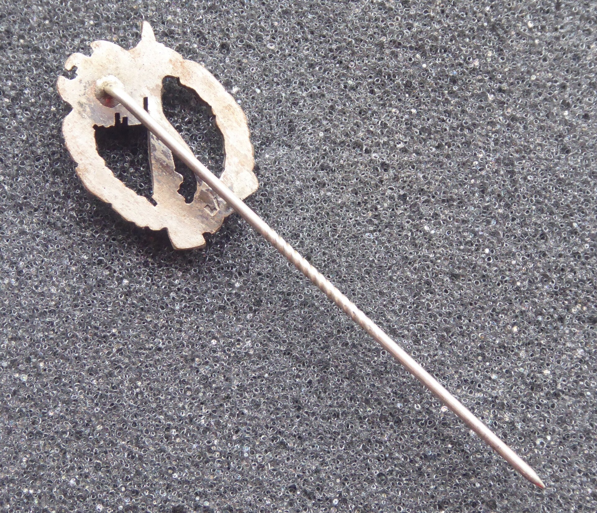 Nice infantry assault badge stickpin by Paul Meybauer, Berlin. Zinc construction. The stickpin is of excellent quality and has some nice amount of finish still left. The stickpin is marked L/13 which indicates production by Meybauer. Nice stickpin in excellent condition. No repairs, no damage.