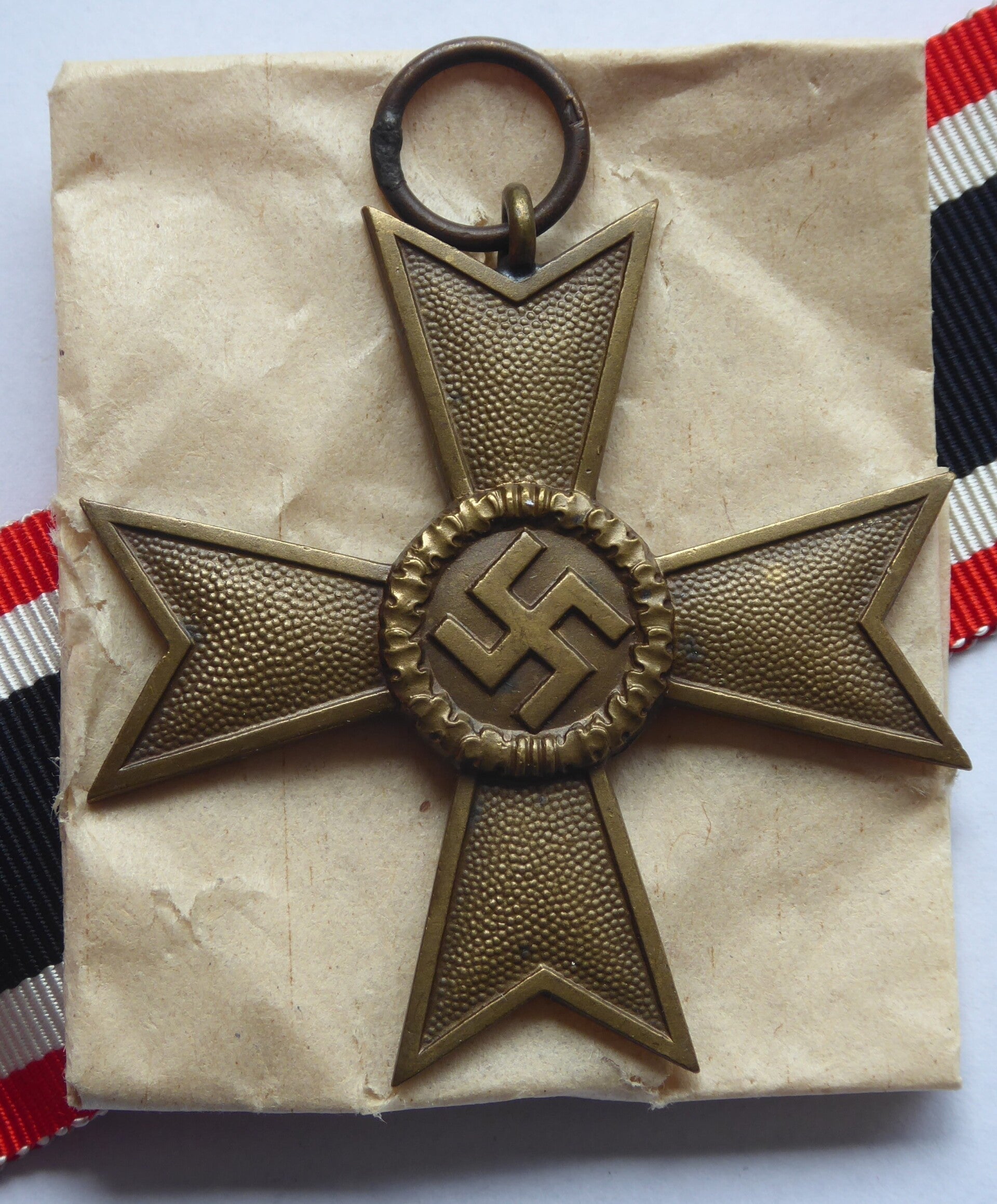 KVK 2nd Class without Swords by Deschler & Sohn, München. Buntmetall construction. The medal is marked on the ring with PKZ code "1" indicating production by D&S. Nice cross in mint unissued condition, comes with its original long ribbon and packaging. This cross originates from the famous "Deschler Hoard". Nice original mint cross! No repairs, no damage.