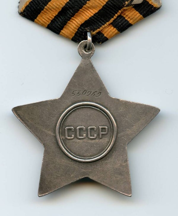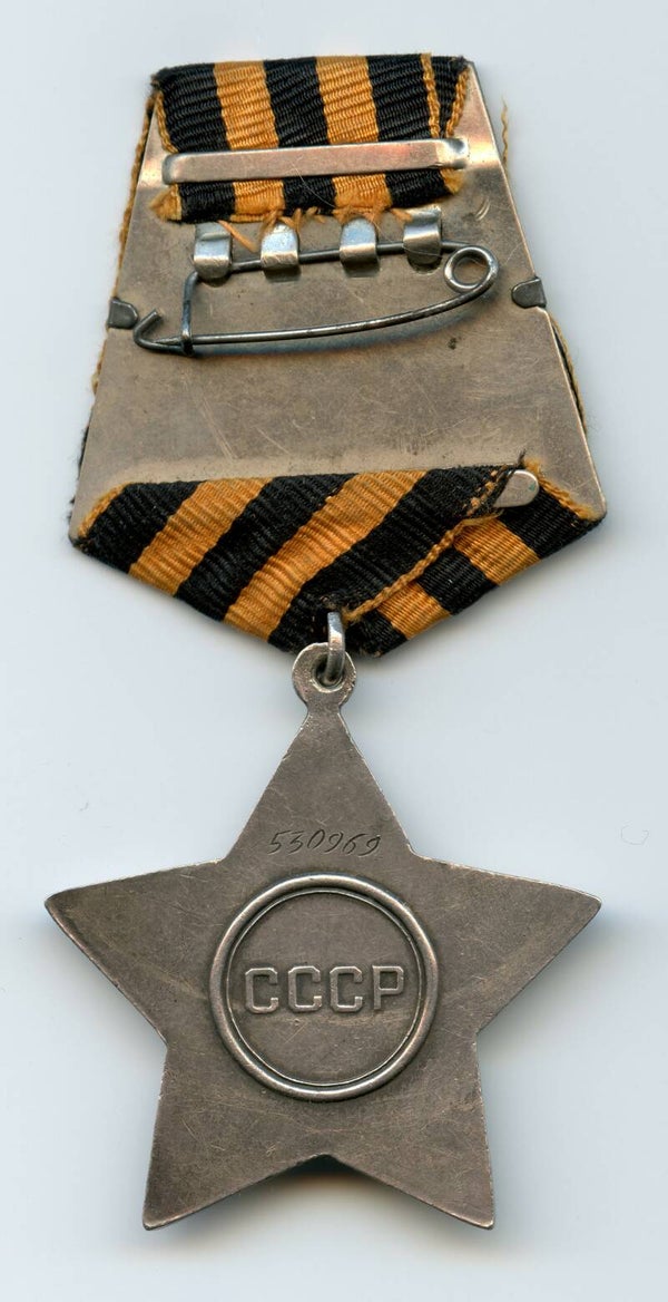Very nice original Order of Glory 3rd class medal. The medal comes with its original ribbon and double steel suspension. The medal remains in a great condition and is serial numbered "530969". Very nice Order of Glory 3rd class medal with a great patina! No repairs, no damage.