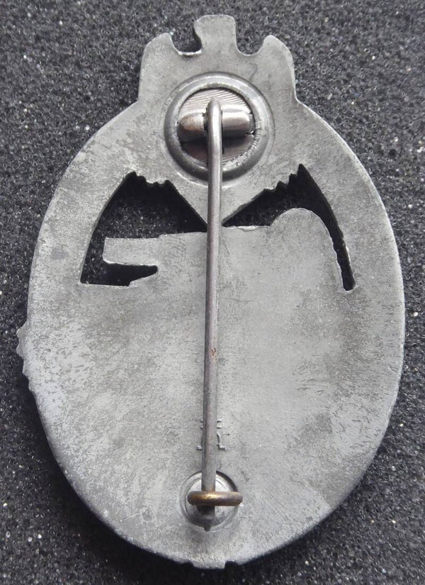 Nice silver Panzer Assault Badge by Hermann Aurich, Dresden. Zinc construction with crimped in hardware. The badge is maker marked with the typical Aurich logo. The badge remains in a great condition with a nice amount of silver finish left. Nice Aurich badge in great condition. No repairs, no damage.