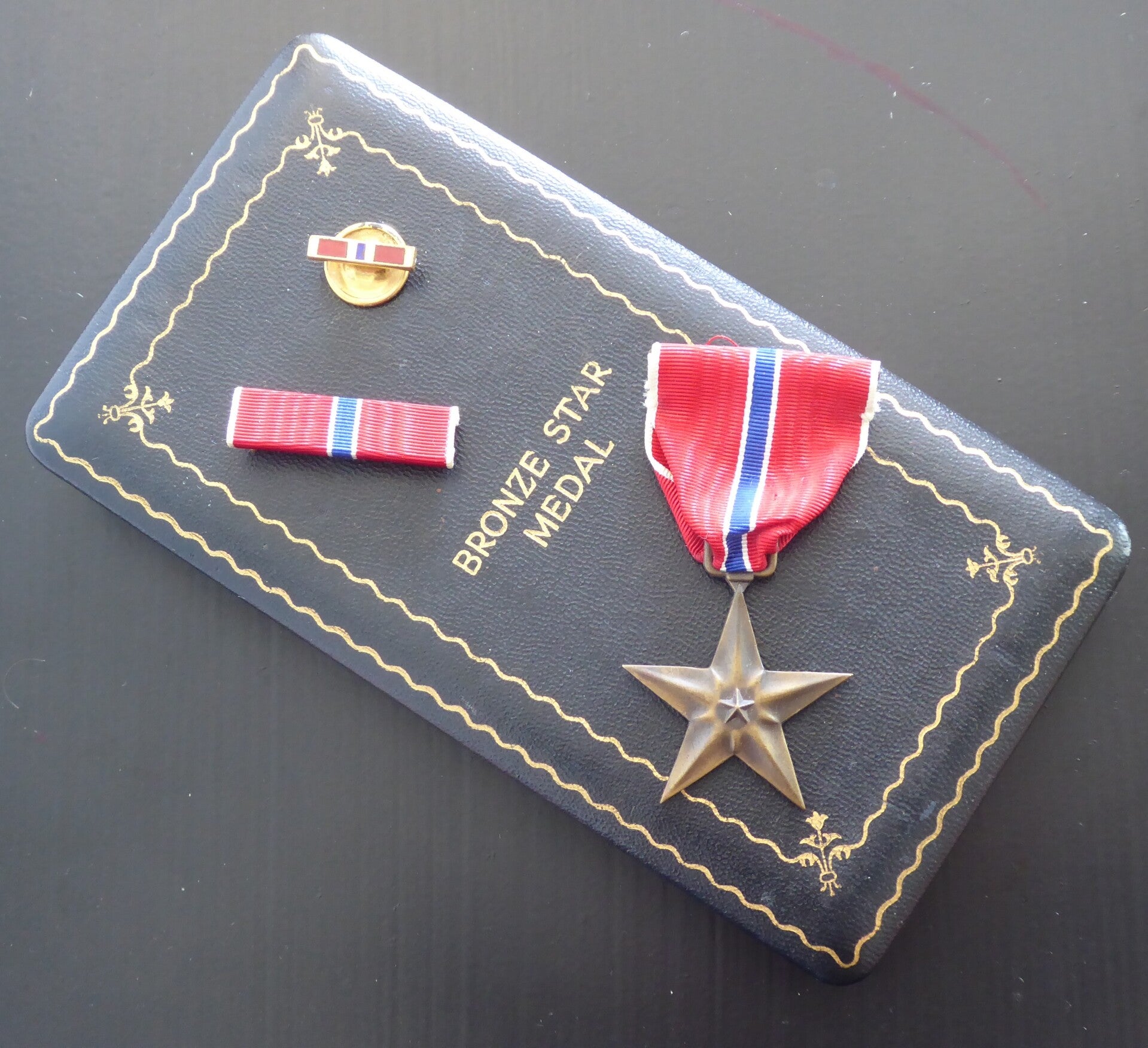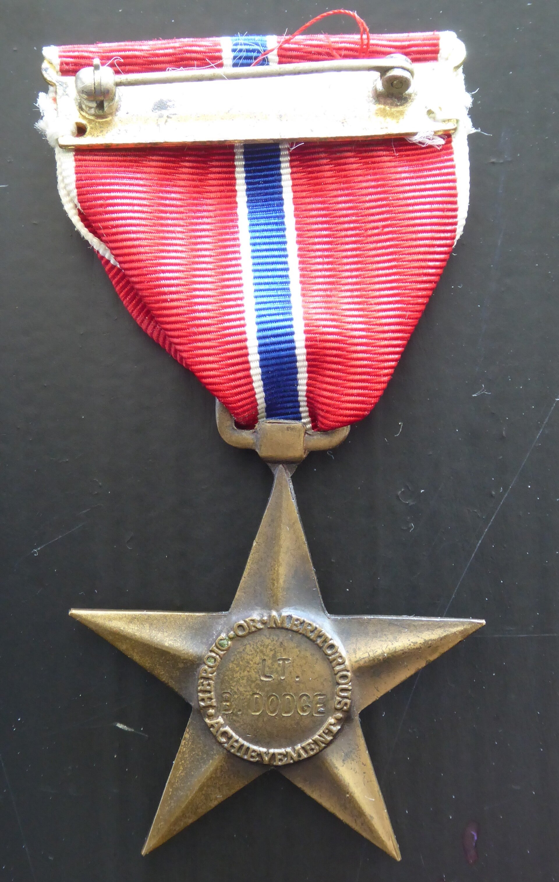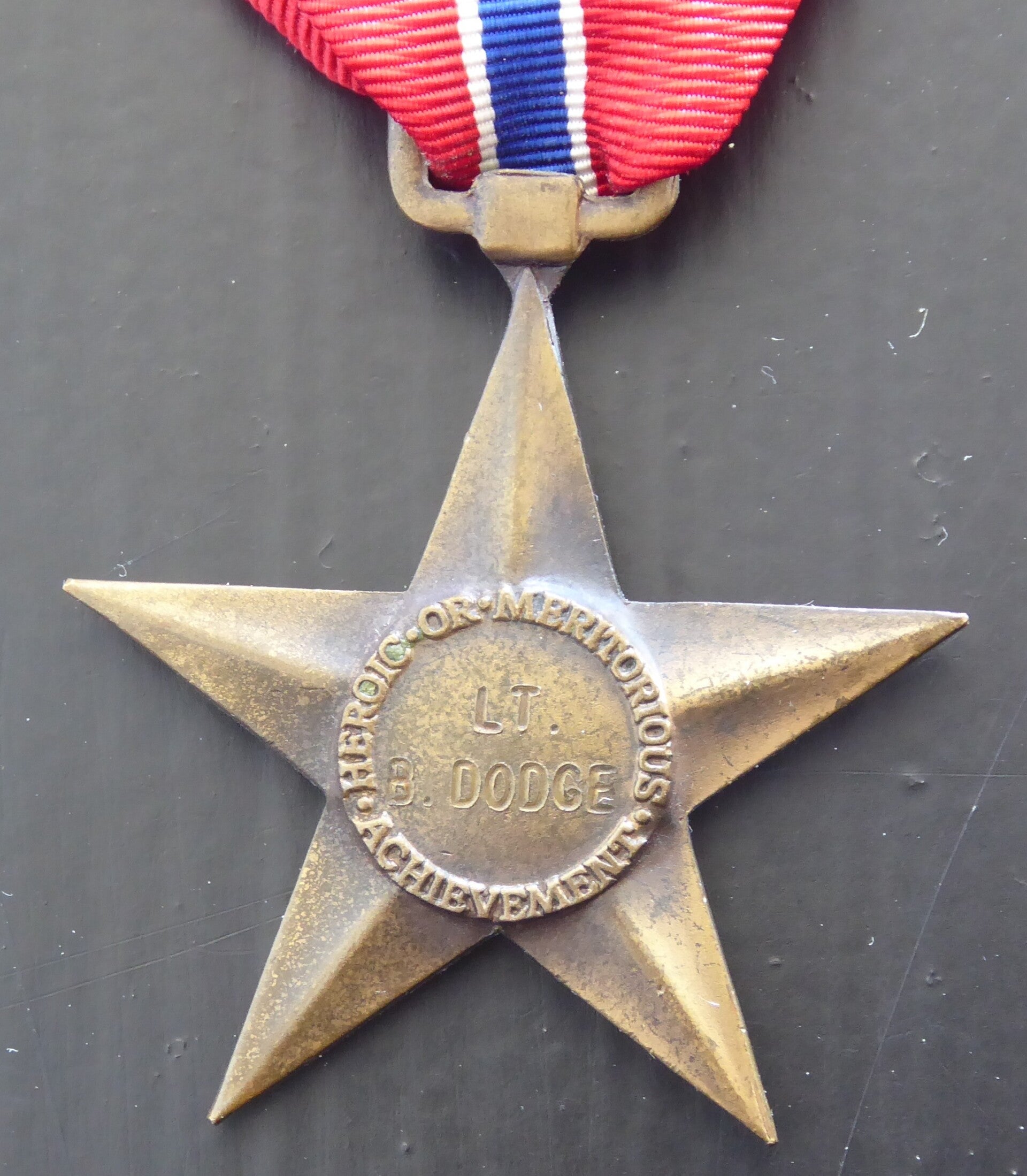 An original complete and named WW2 cased Bronze Star medal. The medal comes in its original case of issue together with its ribbon bar and lapel pin. The medal comes with a slot brooch mechanism and its original ribbon, indicating production during WW2. The Bronze Star is name engraved with Lt. B Dodge. Great set in great condition! No repairs, no damage.