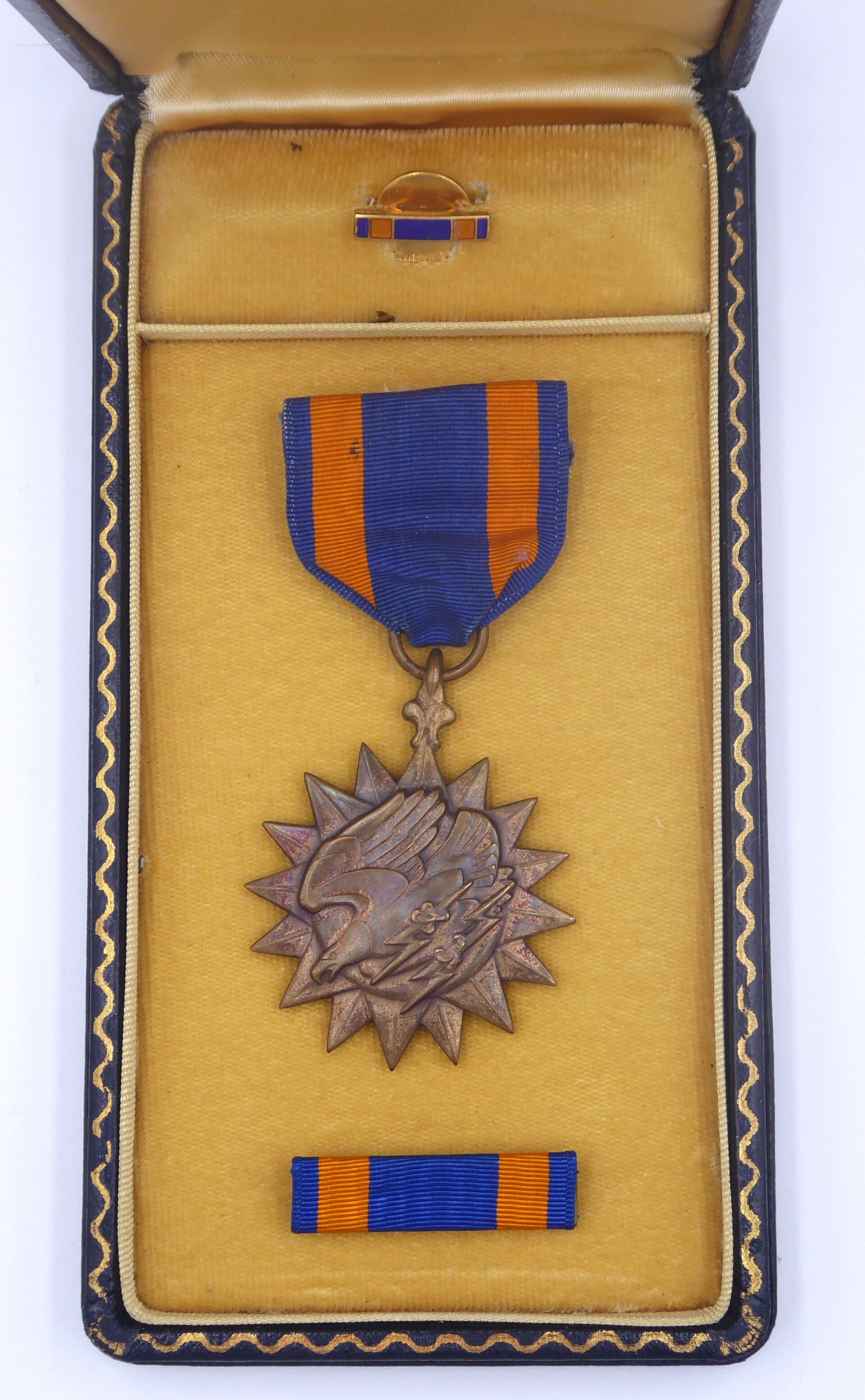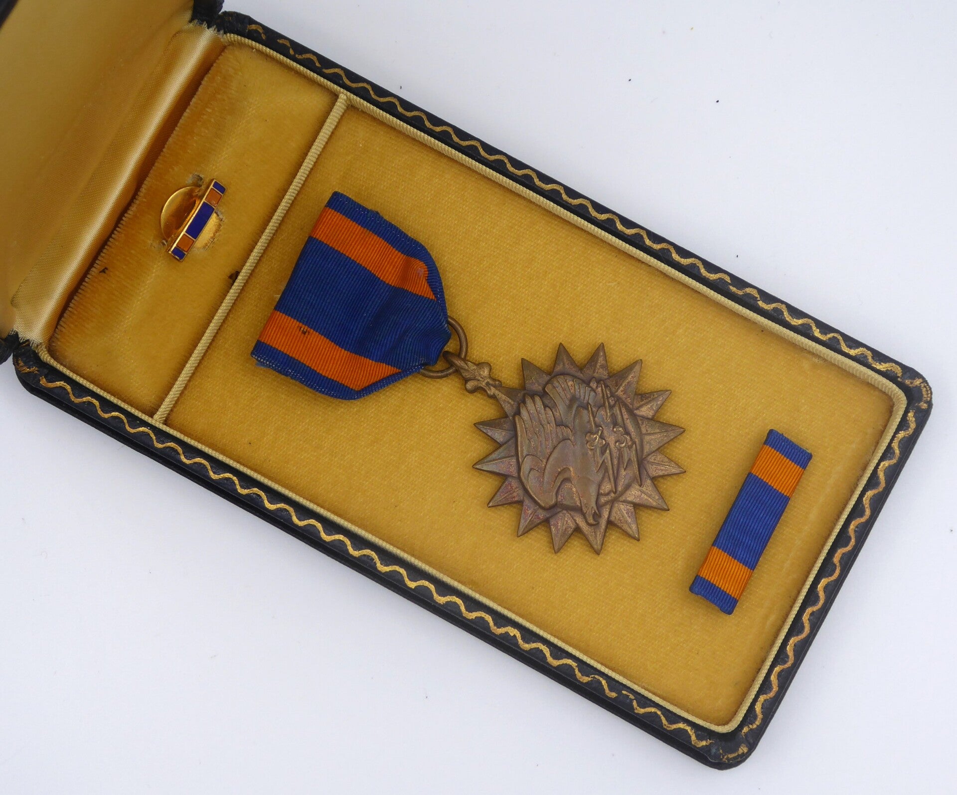An original complete WW2 cased air medal. The medal comes in its original case of issue together with its ribbon bar and lapel pin. The medal comes with a slot brooch, indicating production during WW2. Great set in great condition! No repairs, no damage.