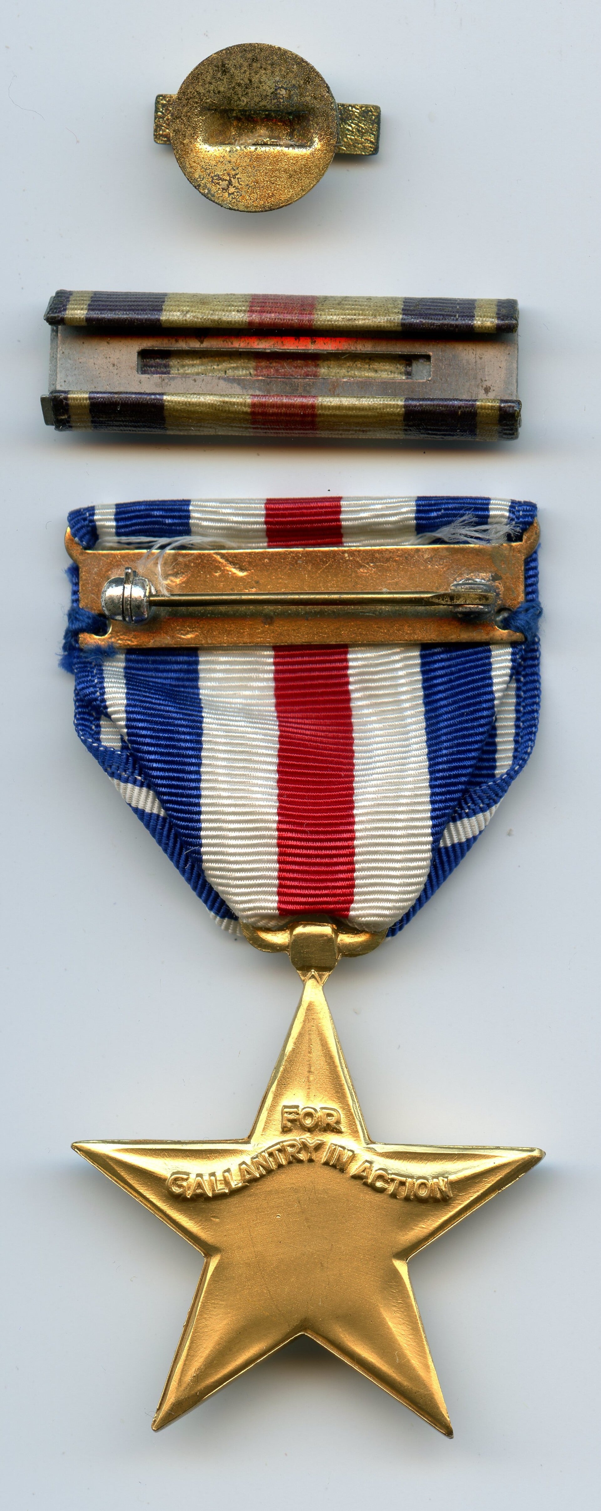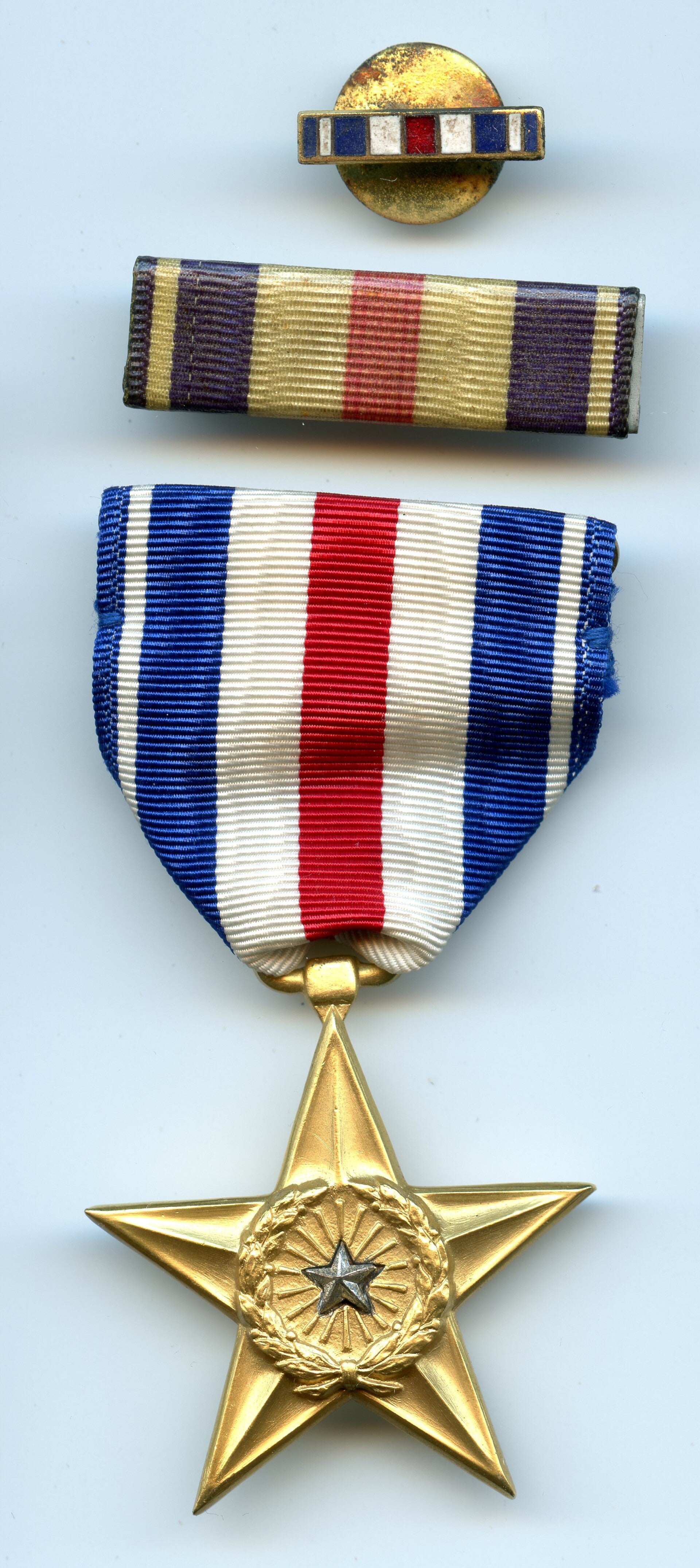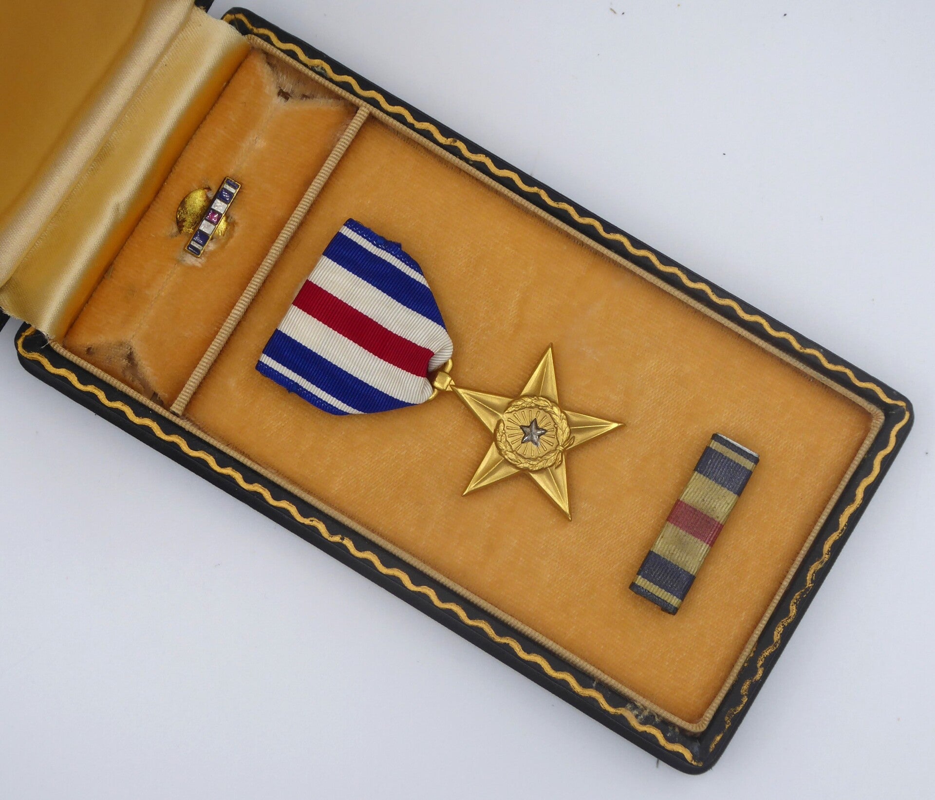 An original complete WW2 cased Silver Star medal. The medal comes in its original metal case of issue together with its ribbon bar and lapel pin. The medal comes with a slot brooch mechanism and its original ribbon, indicating production during WW2. Excellent set in near mint condition! No repairs, no damage.