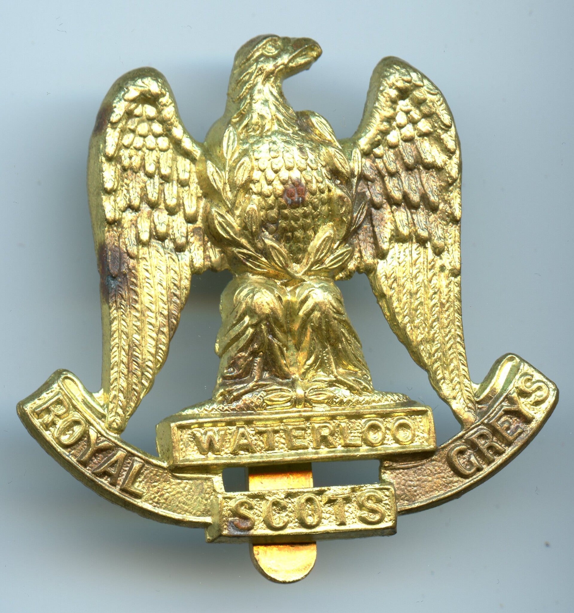 Nice British 2nd Dragoons Royal Scots Greys Cap Badge. Badge remains in good condition. No repairs, no damage.